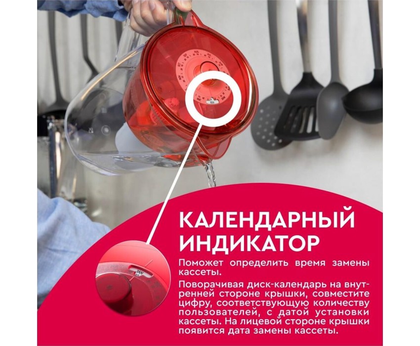 Классический кувшни для большой семьи, объем кувшина 3,6 литра, объем воронки 1,5 литра, классическая круглая форма, мерная шкала на корпусе, календарный индикатор замены кассеты, срок службы не более 5 лет, кассета в комплекте, ресурс кассеты 350 л.