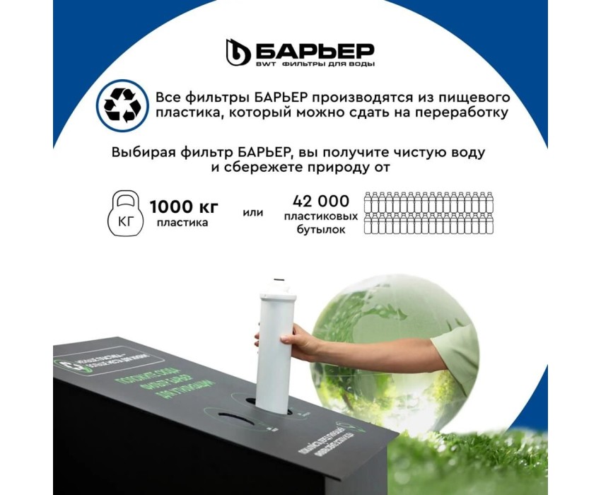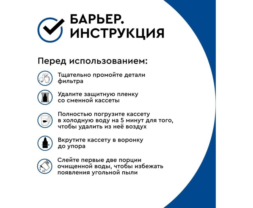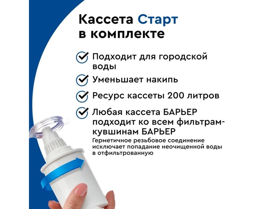 объем отфильтрованной воды: 1.6 л; объем воронки: 1.5 л; любая кассета Барьер подходит ко всем фильтрам-кувшинам Барьер