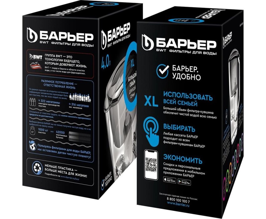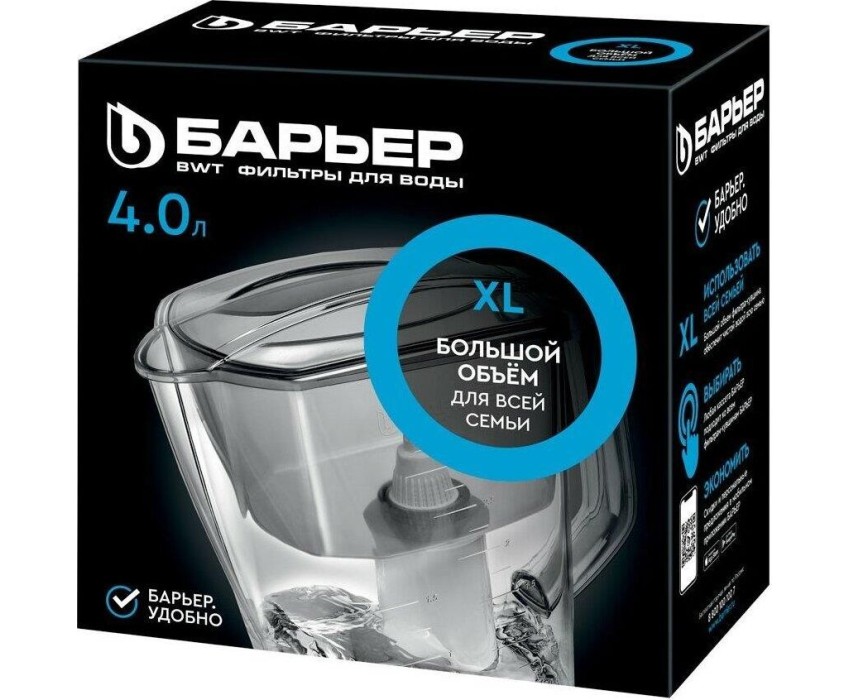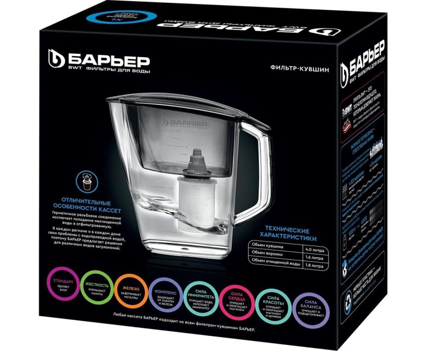 Большой кувшин для всей семьи,объем кувшина 4 литра, объем воронки 1,6 литра, автоматически открывающаяся воронка, мерная шкала на корпусе, срок службы не более 5 лет, кассета в комплекте,ресурс кассеты 350 л.