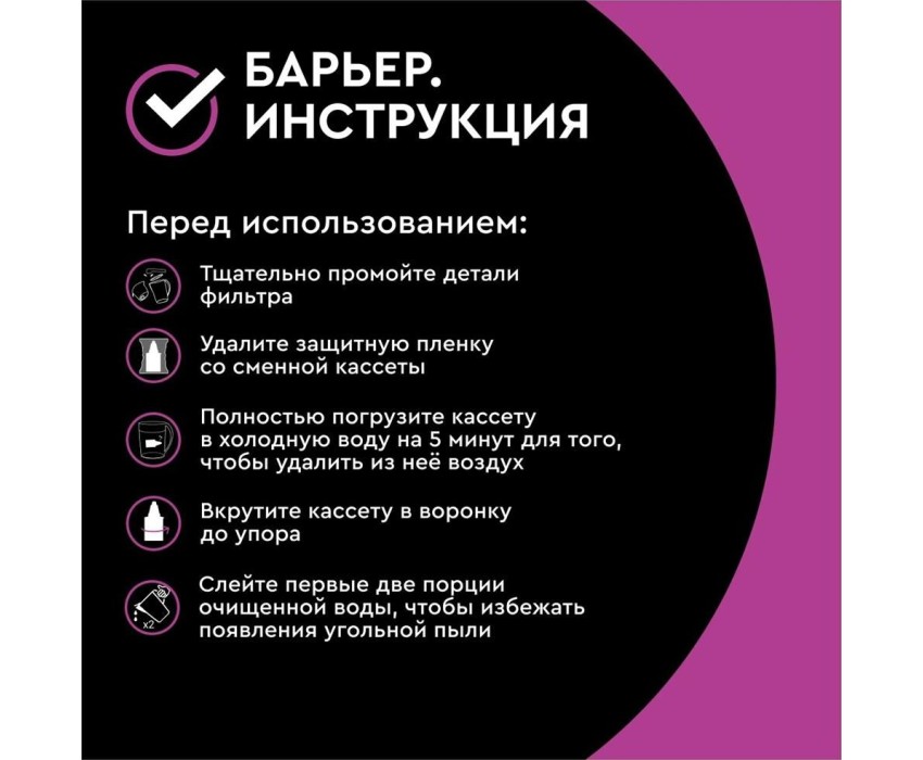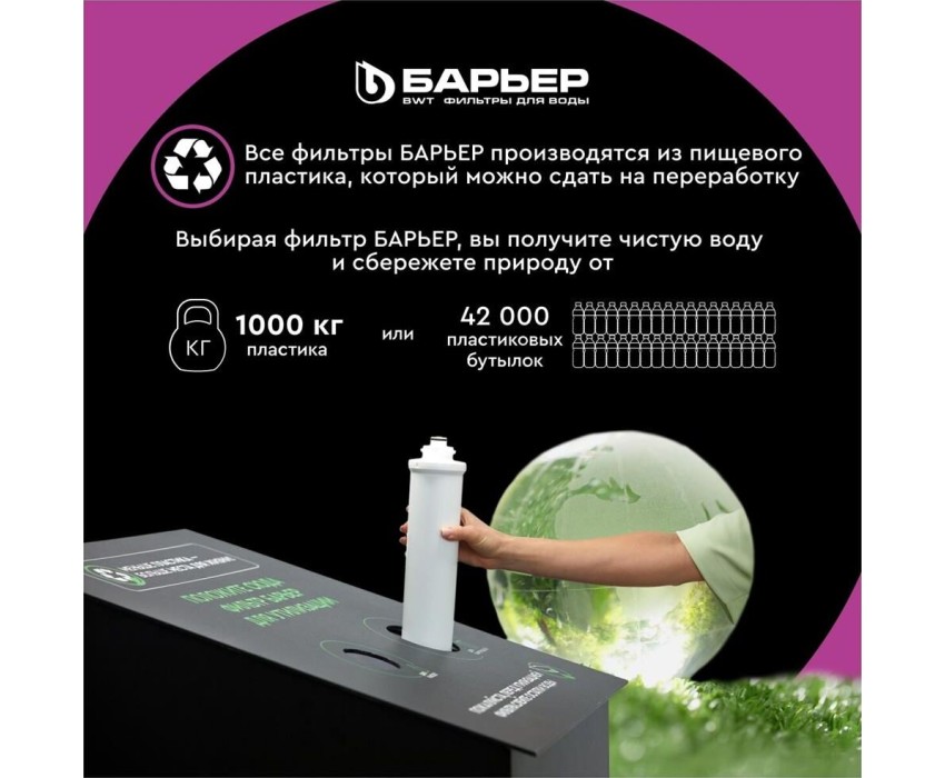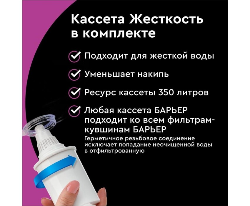 Объём кувшина 4 л, Размеры упаковки 280x150x260мм, Объём очищенной воды 1,6 л, Наличие и тип индикатора ресурса Нет индикатора, Объём воронки 1,4 л, Вес 0.83 кг, Эксклюзивный дизайн Разработан в Студии Артемия Лебедева, Матовый декор, Кувшин декорирован матовыми горизонтальными полосами, которые подчеркивают форму кувшина, Удобная цельнолитая ручка, Удобство, Эргономичный выступ на крышке кувшина, за который ее удобно открывать и закрывать, Качество продукции, Кувшин изготовлен из безопасных материалов, рекомендованных для контакта с питьевой водой, Резьбовое крепление, Особенность фильтров-кувшинов БАРЬЕР — надежное резьбовое крепление кассеты к воронке кувшина, что исключает попадание неочищенной воды из воронки в отфильтрованную воду.