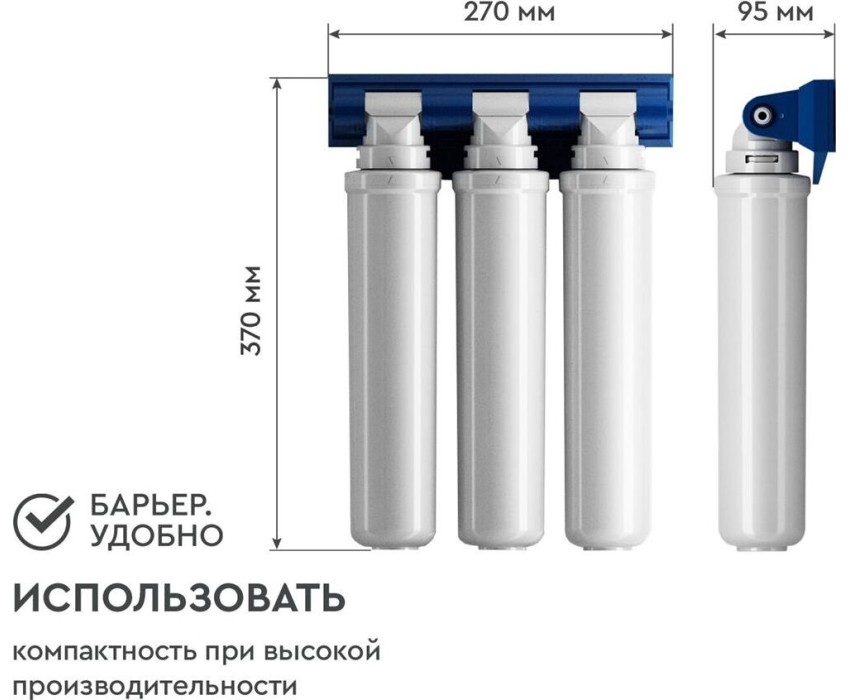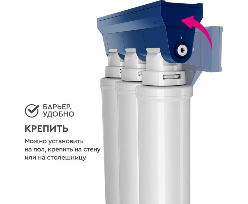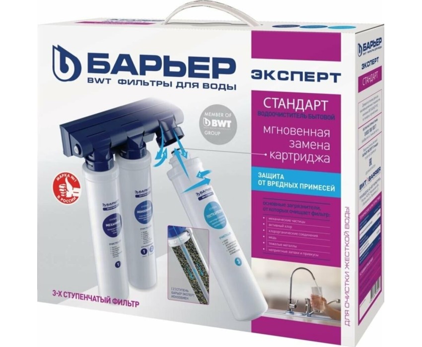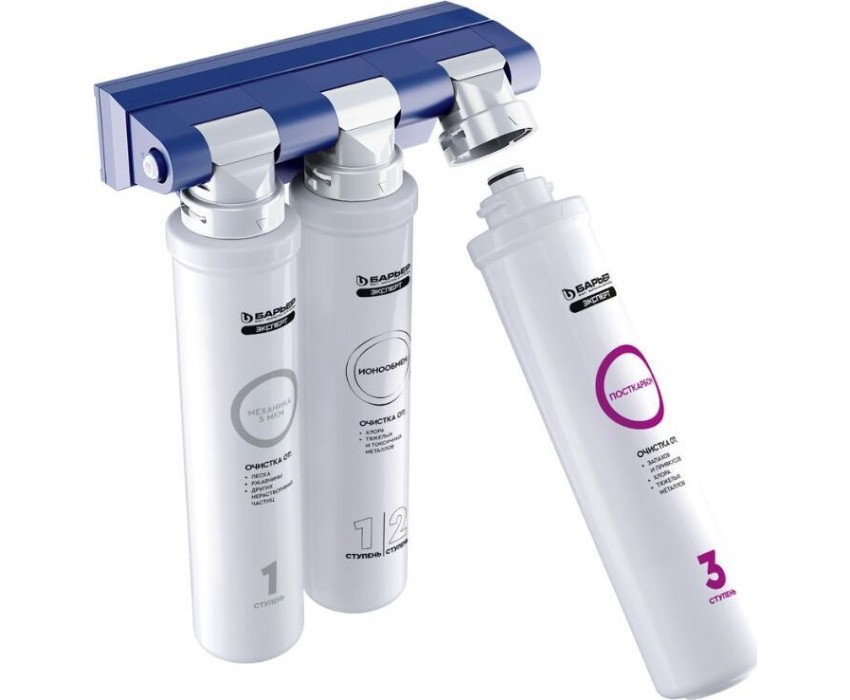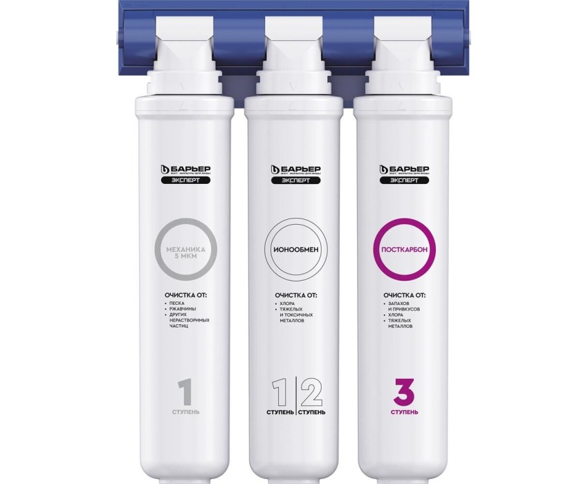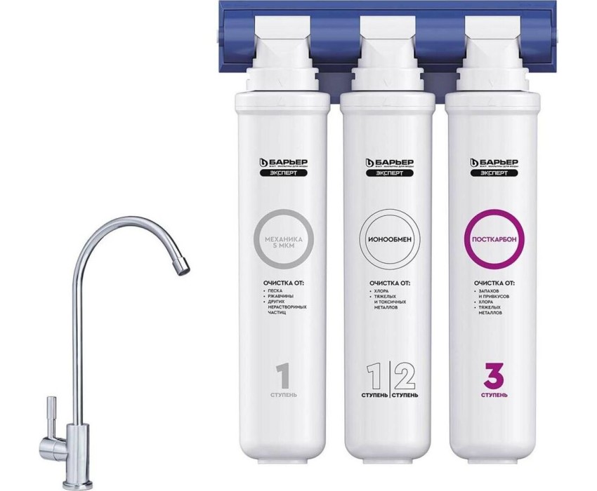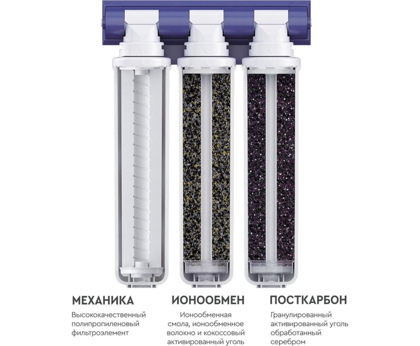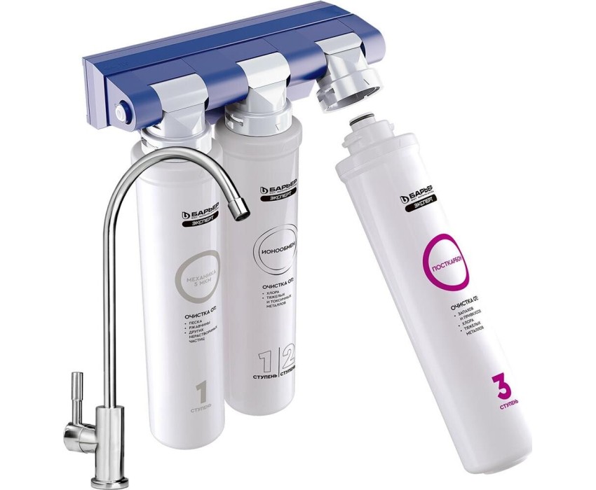 Комплексная очистка водопроводной воды от всех основных содержащихся в ней вредных примесей. Быстрая замена картриджей без специальных инструментов. Особенности: Технология по быстрой замене картриджа OneTouch, Кран в комплекте, 3 ступени очистки, В комплекте: Фильтроэлемент ЭКСПЕРТ Механика, Фильтроэлемент ЭКСПЕРТ ИоноОбмен, Фильтроэлемент ЭКСПЕРТ ПостКарбон