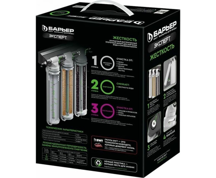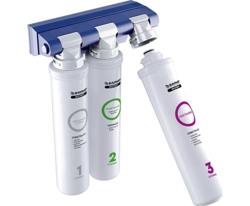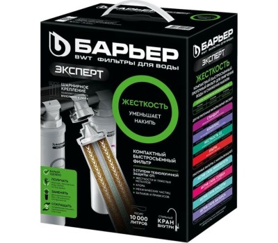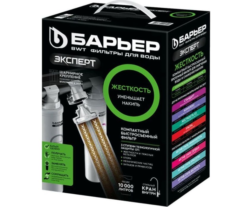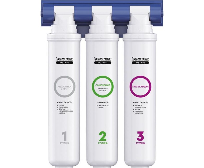 Фильтр Expert Hard, стандартная очистка городской водопроводной воды и снижение жесткости, три ступени очистки, 1-я ступень Механика, 2-я ступень Смягчение, 3-я ступень Посткарбон, защита от крупных механических частиц, активного хлора, ионов тяжелых и токсических металлов, очистка воды от ржавчины, неприятного запаха и привкуса воды, технология byPass увеличивает ресурс и помогает избегать гиперумягчения воды, скорость фильтрации 2 л в минуту, срок службы фильтроэлементов до 1 года, замена картриджей в 1 касание, технология Smart Lock фиксация картриджей гарантия от протечек, температура очищаемой воды +5...+35 градусов, максимальное рабочее давление 7 атм, ресурс фильтроэлементов 10 000 литров, отдельный кран для чистой воды в комплекте.
