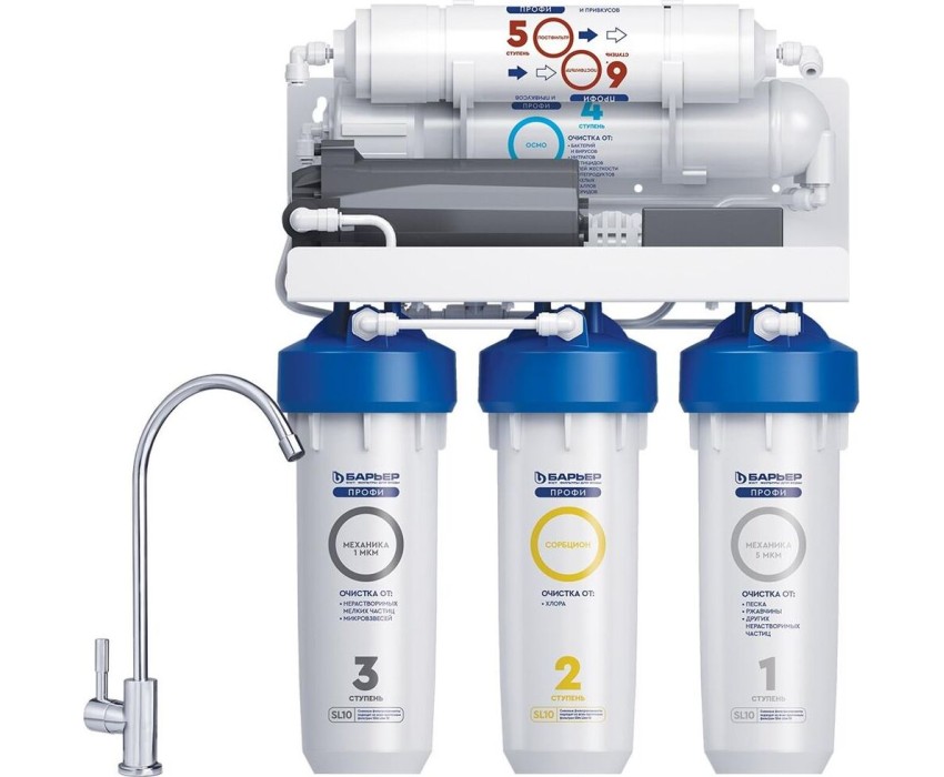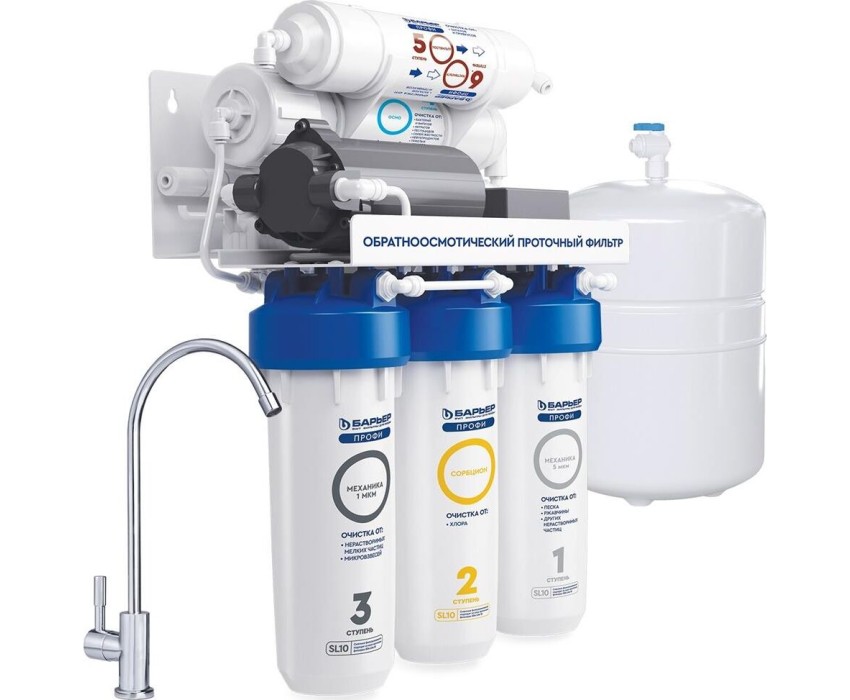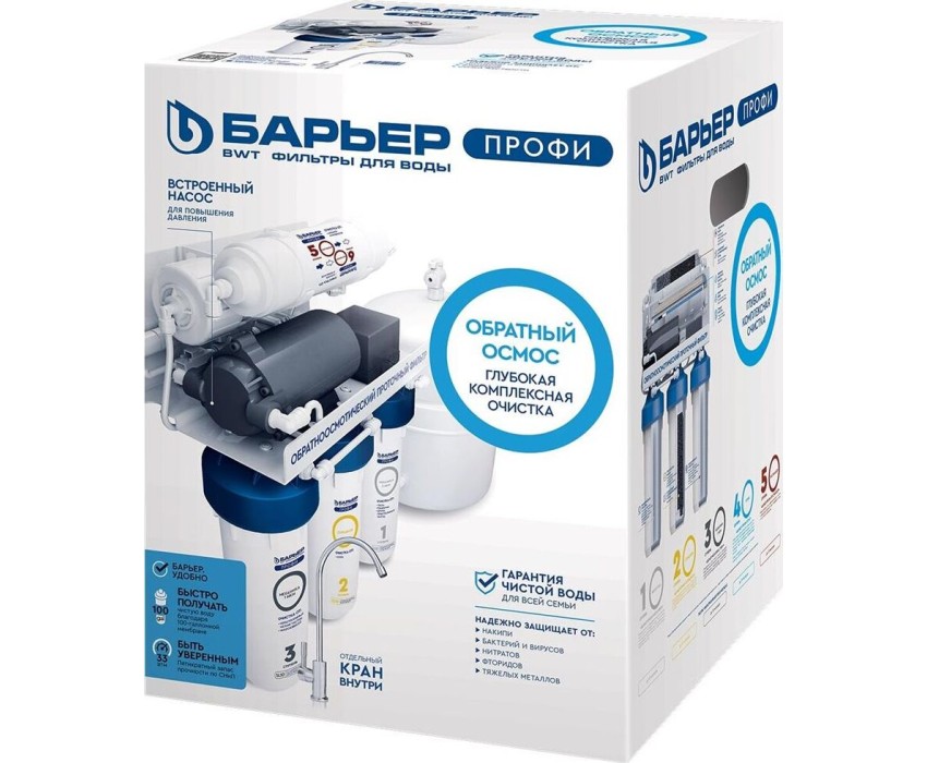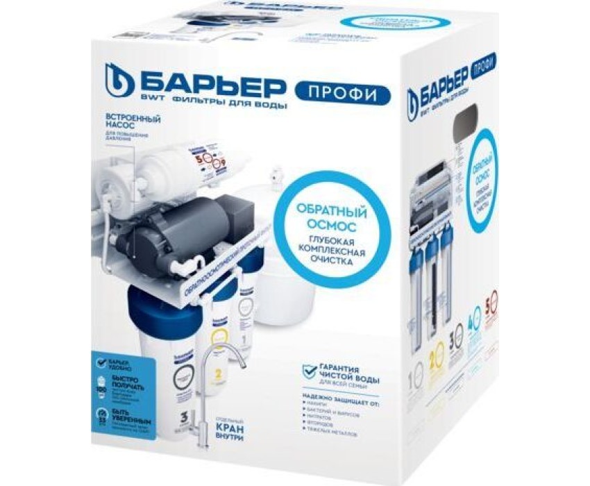 Система для очистки воды методом обратного осмоса с насосом повышения давления. Позволяет обеспечить семью кристально-чистой и водой, не уступающей по качеству бутилированной. Тип очистки воды обратноосмотическая система Объем 8 л. Ресурс 5000 л. Скорость фильтрации 0.34 л/мин. Количество картриджей в комплекте 5 шт. Система очистки пятиступенчатая. Рабочее давление до 7 атмосфер.