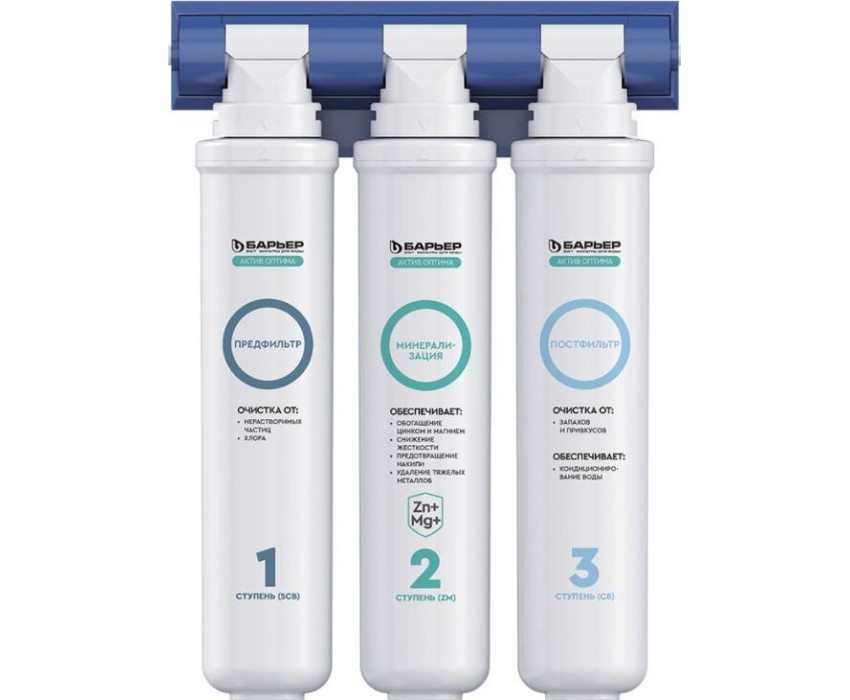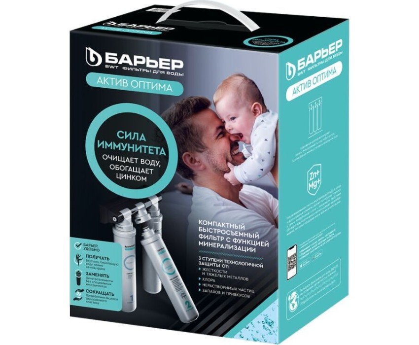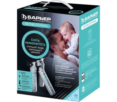 Фильтр БАРЬЕР АКТИВ Оптима Сила Иммунитета с улучшенной формулой обогащения цинком. Эффективная очистка и обогащение воды цинком и магнием. Для тех, кому важна забота о своем здоровье и своих близких. Темп современной жизни, ежедневные нагрузки, неправильное питание сказываются на том, что мы не просто усваиваем меньше цинка и магния, наш организм теряет эти макро- и микроэлементы. Важным источником цинка и магния выступает питьевая вода. По статистике не более 30% магния человек усваивает из пищи и до 70% — из воды. При употреблении воды натощак усваивается до 90% цинка. Помимо обогащения фильтр очищает воду от хлора, органических примесей и тяжелых металлов. Удаляет посторонние привкусы и запахи. Ионообменная смола с уникальными свойствами обогащает воду ионами цинка и магния и снижает образование накипи. В комплекте: Комплект картриджей Актив Оптима Сила Иммунитета