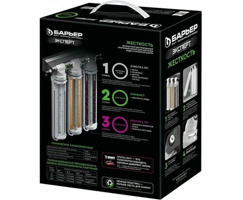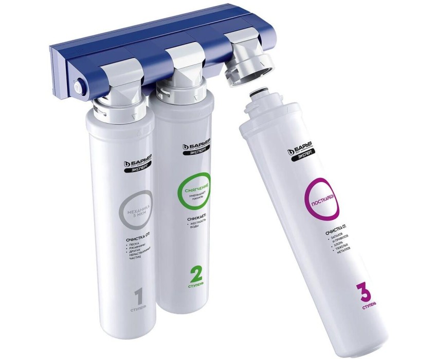 Тип: Водоочиститель. Ресурс: 10000. Картриджей в комплекте: 3. Скорость фильтрации: 2. Подключение к водопроводу: есть. Особенности: Кран для питьевой воды в комплектацию не входит.. Система очистки: трехступенчатая. Место установки: под раковину. Материал корпуса: пластик. Вес товара: 2.65. Тип очистки воды: сорбционная(проточная) система. Фильтры/картириджи в комплекте: Картридж Эксперт Механика, Картридж Эксперт Смягчение, Картридж Эксперт ПостКарбон. Габариты упаковки (ед) ДхШхВ: 0.25x0.25x0.331. Вес упаковки (ед): 1. Гарантия: 12 мес.. Рабочее давление: до 7атм.. Температура воды: 5-35°С. Цвет: белый. Размеры (ШxВxГ): 248x336x150 мм. Фильтрация загрязнений: растворенного железа, солей жесткости, тяжелых металлов, хлора. Тип очистки: сорбционная(проточная) система, трехступенчатая. Установка: под раковину. Скорость фильтрации: 2 л/мин. Особенности: подключение к водопроводу. Ресурс картриджа: 10000 л. Температура воды: 5-35°С. Рабочее давление: до 7атм
