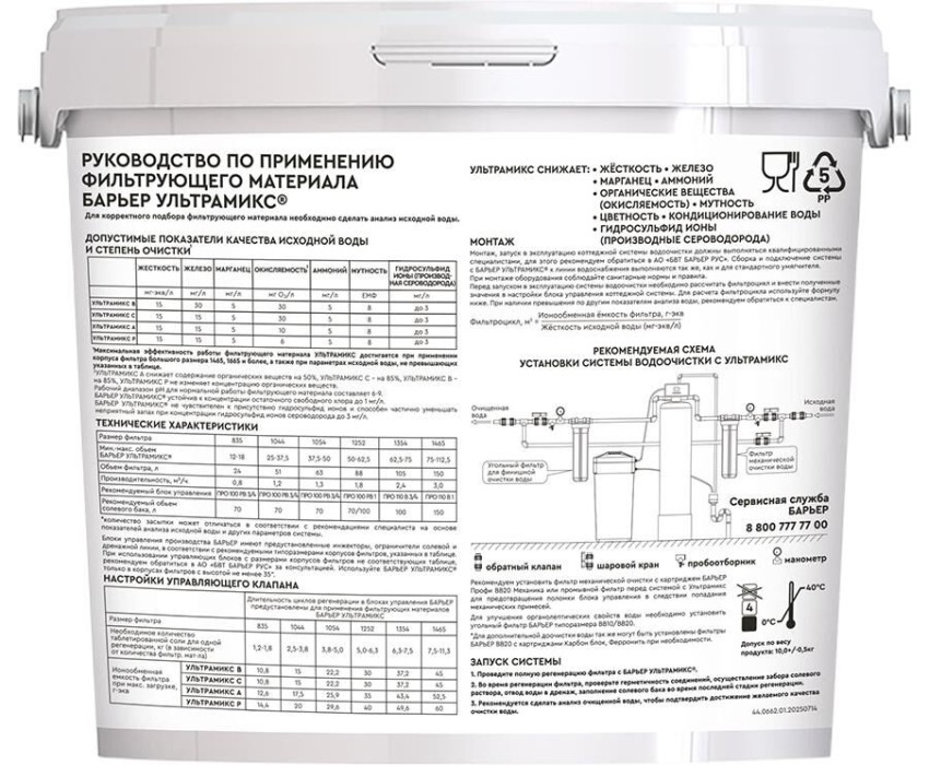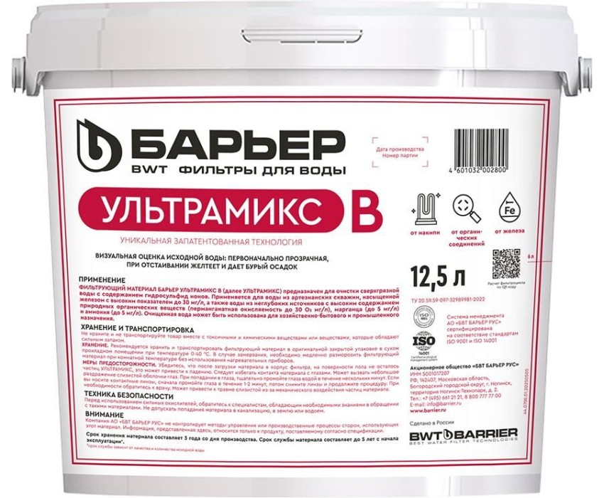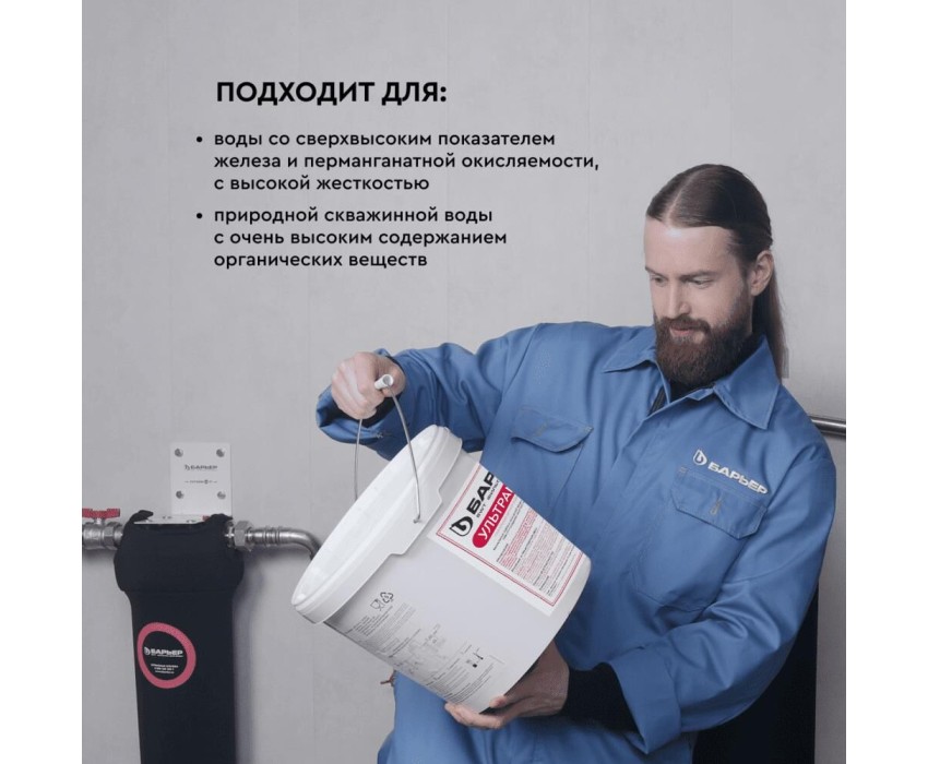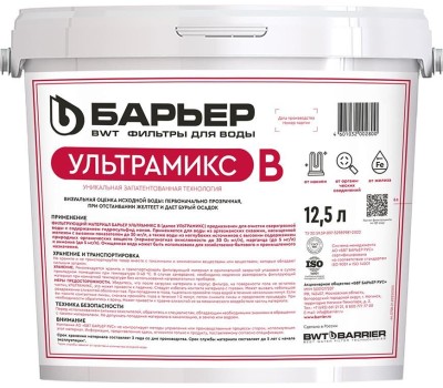 Фильтрующий материал БАРЬЕР С211303 БАРЬЕР ULTRAMIX B, 12,5 л Применяется для очистки воды со сверх-высоким содержанием железа, жесткости, марганца и высокой перманганатной окисляемостью, в составе коттеджных систем