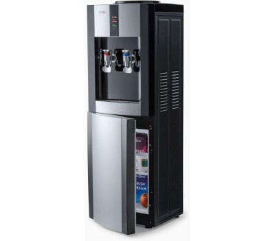 Напольный кулер для воды с верхней загрузкой бутыли в корпусе черного цвета с серебристыми вставками. Аппарат имеет два удобных крана для подачи воды типа "нажим кружкой". Краны с внутренней резьбой для удобной замены в случае необходимости. Оснащен встроенным шкафчиком объемом 13 литров (140х230х325 мм). Кулер только с нагревом без охлаждения. Производительность - 5 л горячей воды в час.