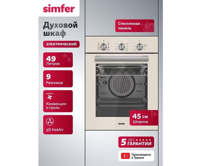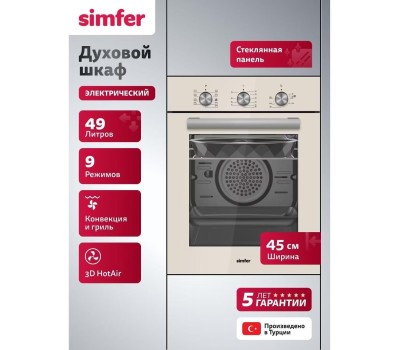 ВСТРАИВАЕМАЯ ЭЛЕКТРИЧЕСКАЯ ДУХОВКА • Класс энергоэффективности А • Мультифункциональная духовка • Количество режимов работы: 9 • Электрический термостат • Механический таймер • Управление: поворотные переключатели • Очистка камеры духовки: эмаль ле?гкои?