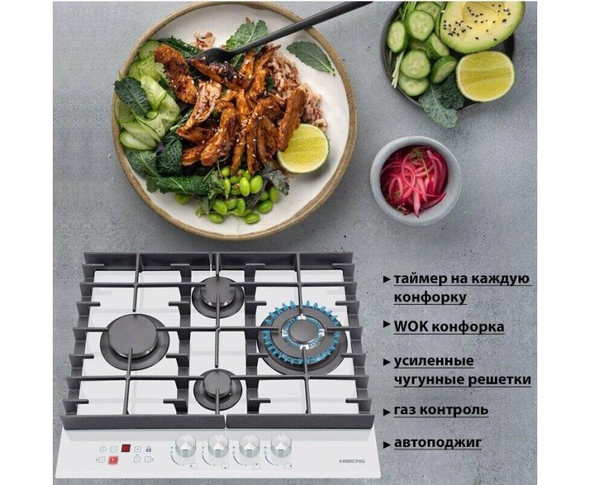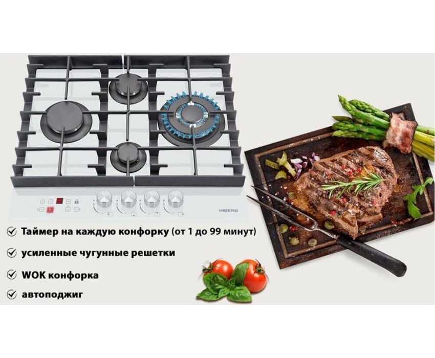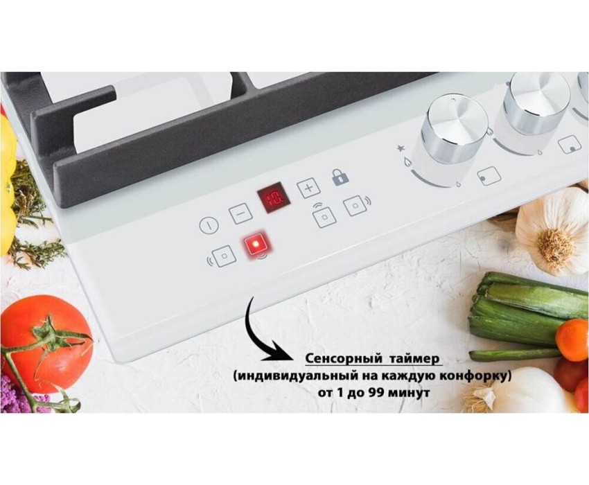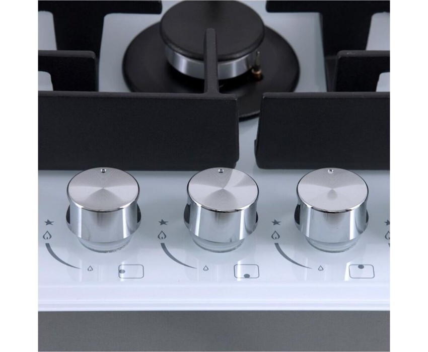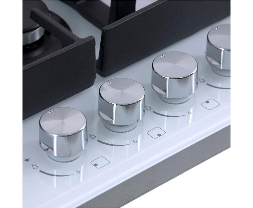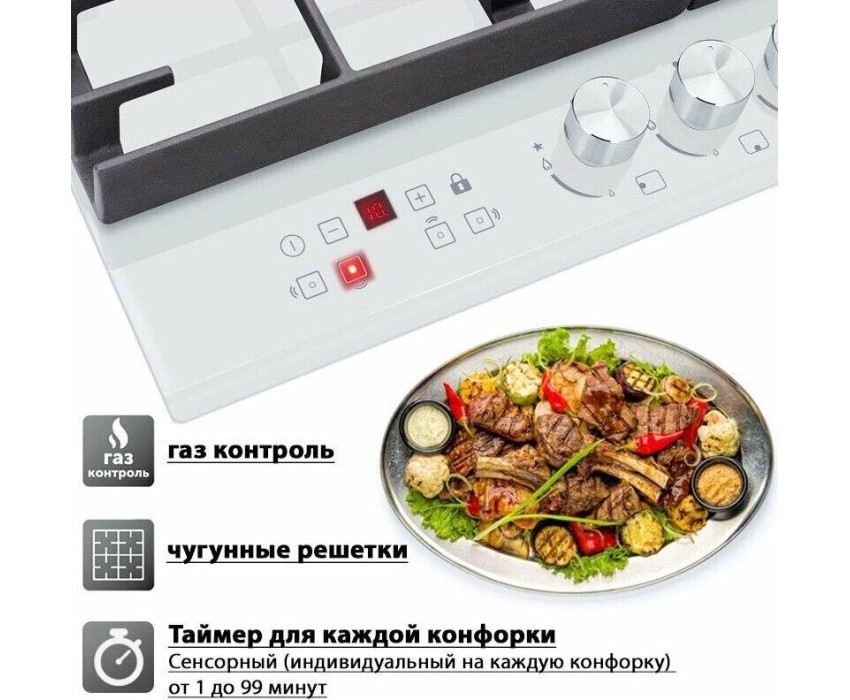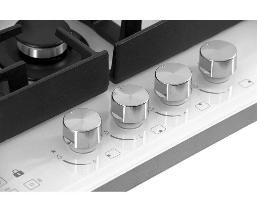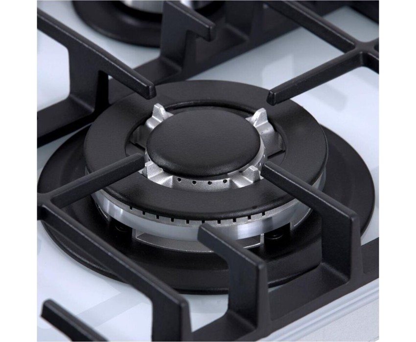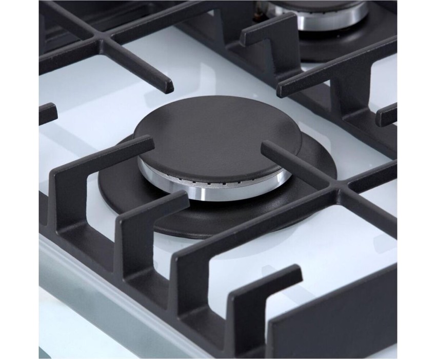 Панель конфорок: Закаленное стекло, Чугунные решетки: Усиленные, Тип электроподжига: Автоматический, Газ-контроль конфорок: Да, Таймер: Индивидуальный, с отключением, Ширина (см): 58.4, Цвет белый