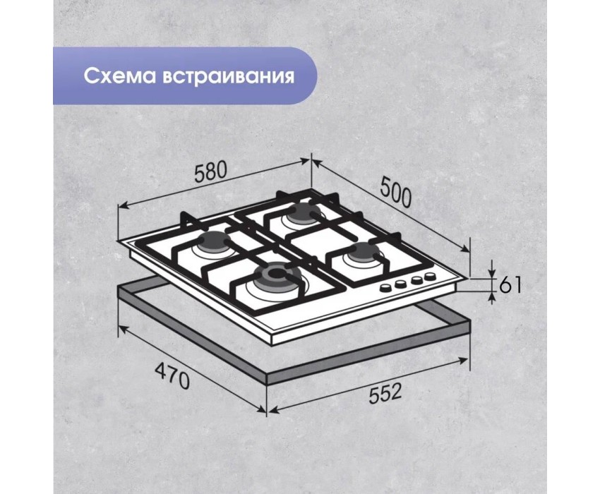 Общие параметры: Мощность горелок: • 1 горелка – 3400 Вт (WOK) • 2 горелки – 1880 Вт • 1 горелка – 900 Вт • Общая мощность – 8060 Вт • WOK-конфорка с тройным контуром пламени • Электроподжиг на каждой конфорке • Газ-контроль на каждой конфорке