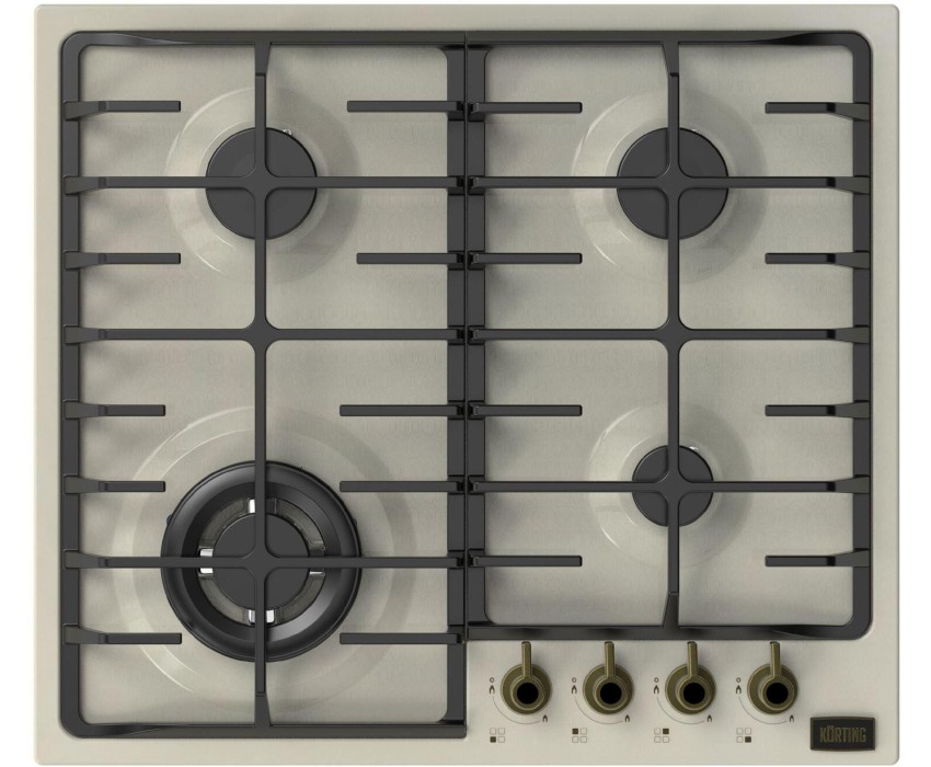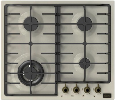 Газовая варочная панель 60см в ретро-дизайне, 4 высокоэффективные конфорки, WOK- сверхмощная конфорка, автоматический электроподжиг, газ-контроль каждой конфорки, передние переключатели, чугунные решетки, чугунный адаптер для WOK-конфорки и адаптер для кофейника, цвет- слоновая кость, цвет ручек- бронза.