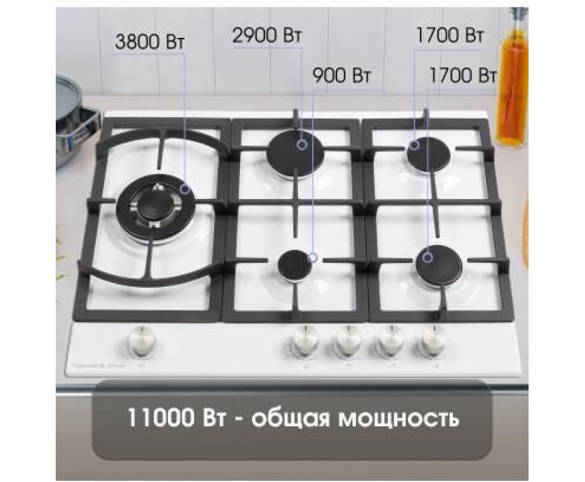 Газовая варочная панель. 5 конфорок. Управление фронтальное. Переключатели поворотные. Материал поверхности: металл. Материал решеток/крышек горелок: чугун. Общая мощность: 11000 Вт. Газ-контроль. Электроподжиг на каждой ручке. WOK-конфорка. Адаптер для вока. Адаптер для кофе. Переходники для разных типов газа. Габариты (ШхГхВ): 690*510*49 мм. Длина шнура питания - 900 мм.