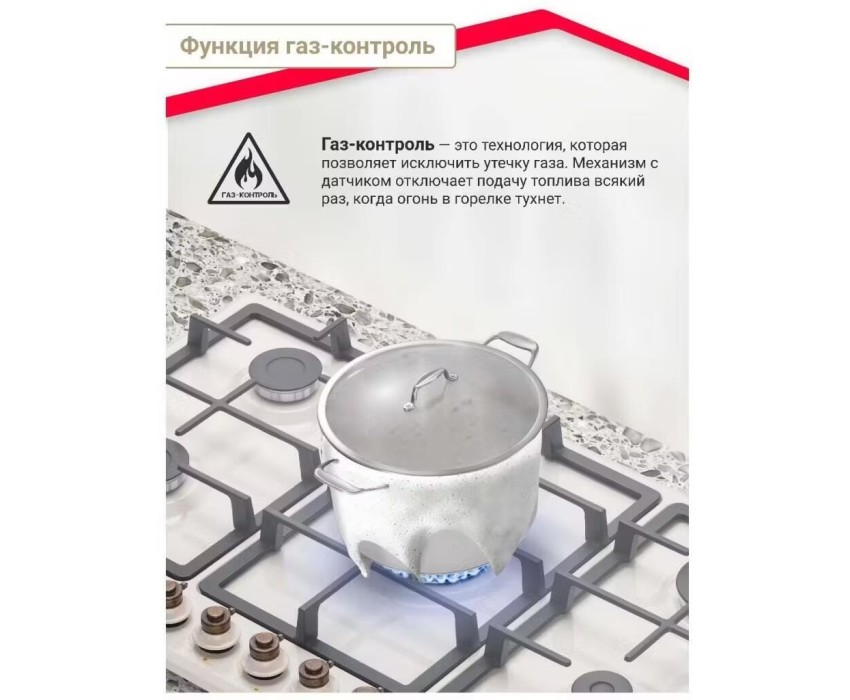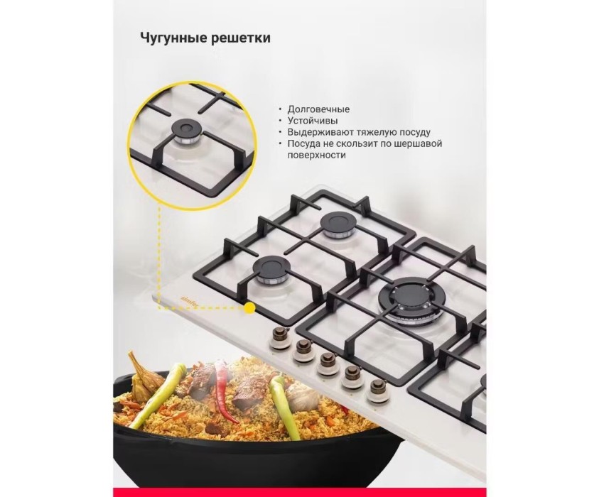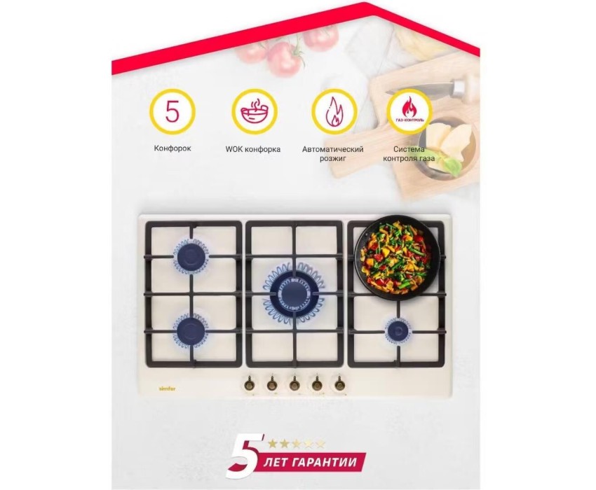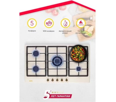 "• Независимая газовая варочная поверхность 70 см. • Чугунная решетка • Кол-во конфорок – 5 (1 WOK конфорка повышенной мощности) • Газконтроль • Автоматический розжиг • Цвет – ретро бежевый"