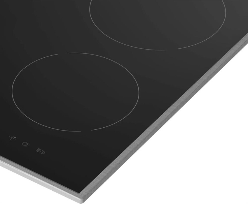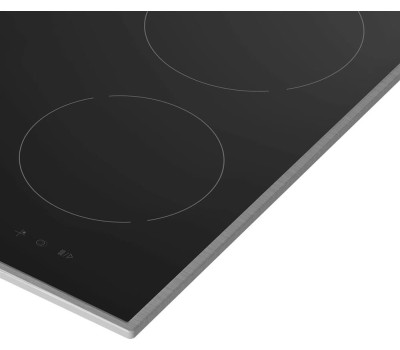 Стеклокерамическая варочная поверхность; 4 зоны, двойная зона расширения, сенсорное управление слайдерного типа, таймер; защита от детей; индикация остаточного тепла; рамка из нержавеющей стали; цвет: черный