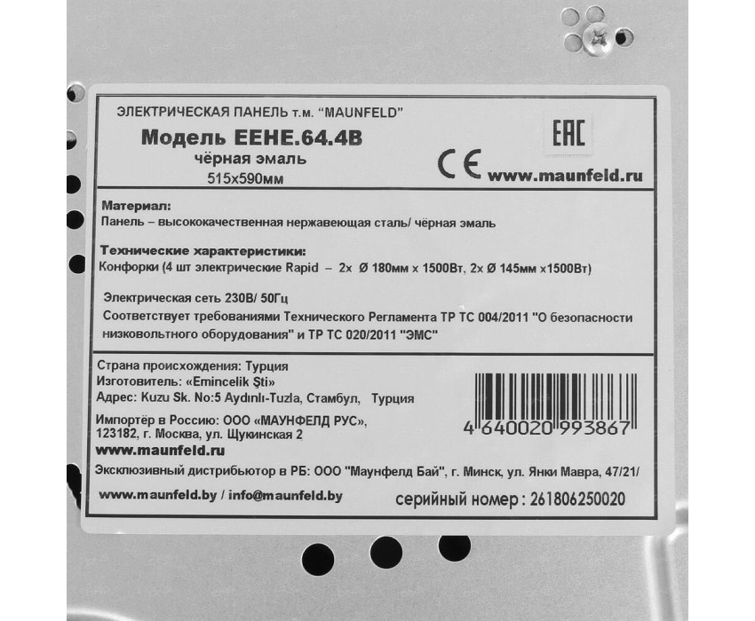 MAUNFELD Электрическая варочная поверхность EEHE.64.4B, конфорок: 4 шт., эмаль, независимая, черный