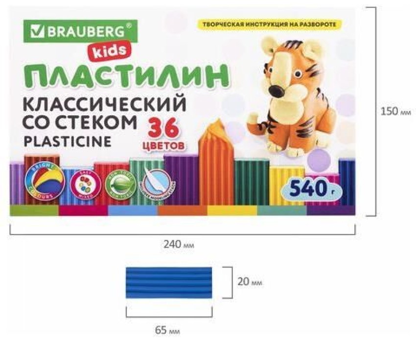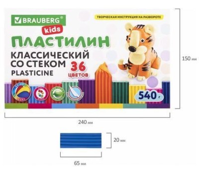 BRAUBERG Пластилин 106678, классический, 36 цветов, 540грамм, картонная коробка, ассорти