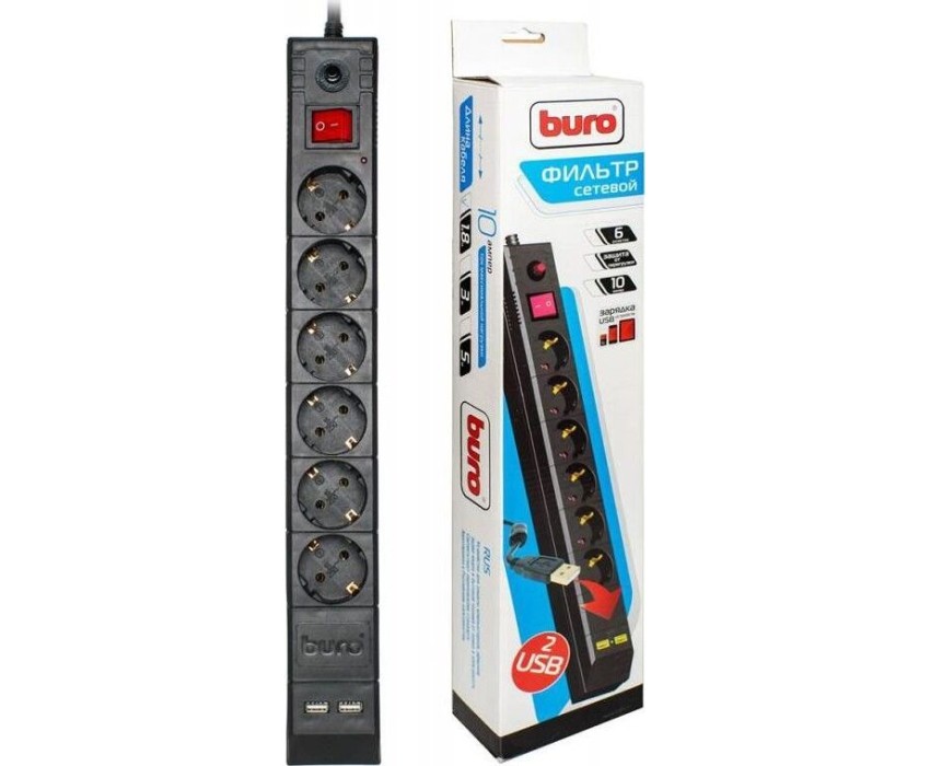 Сетевой фильтр BURO BU-SP5-USB-2A-B 5м 6 розеток черный