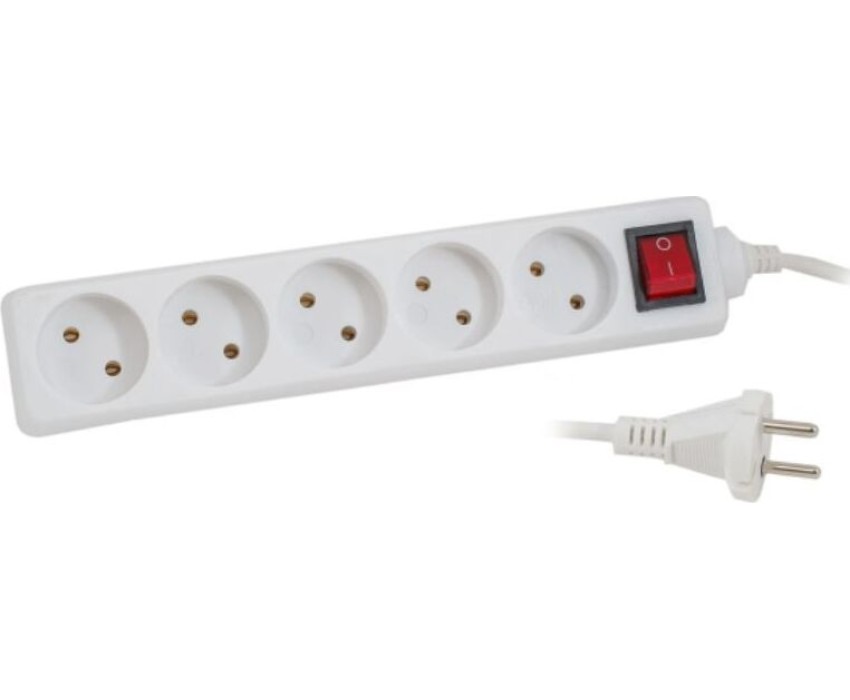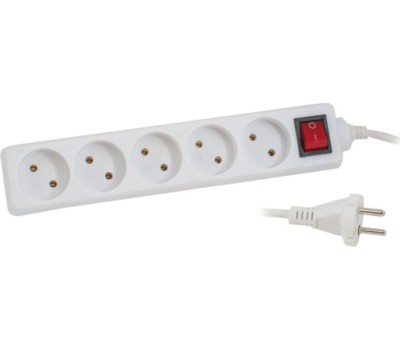 Колодка на 5 розеток Длина провода 5 м. Провод ПВС с сечением 2х0,75 мм2. Кнопка включения Макс нагрузка 2200 Вт Сила тока 10 А Материал - негорючий, ударопрочный РР-пластик. Корпус неразборный. Цвет-белый
