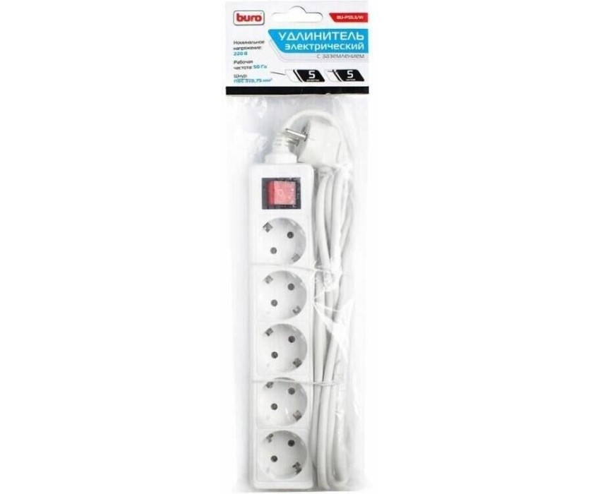 [Сетевые фильтры] BURO Сетевой удлинитель 5 розеток, 5 метров, (BU-PS5.5/W), белый (пакет ПЭ) {828018}