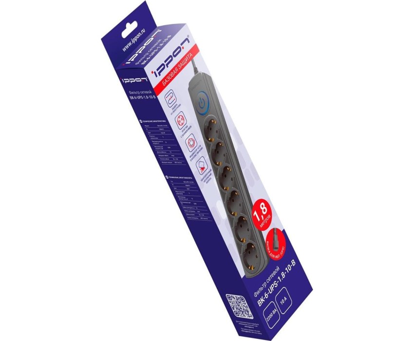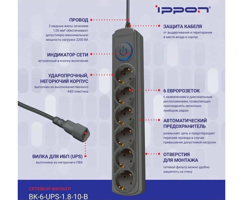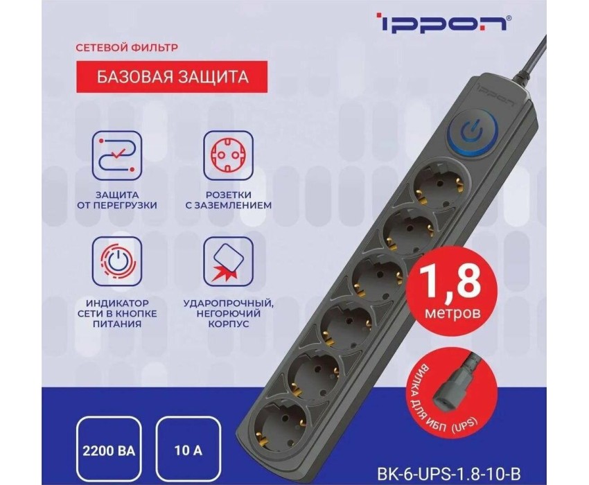 Сетевой фильтр IPPON Сетевой фильтр BK-6-UPS-1.8-10-B, 1.8м, черный