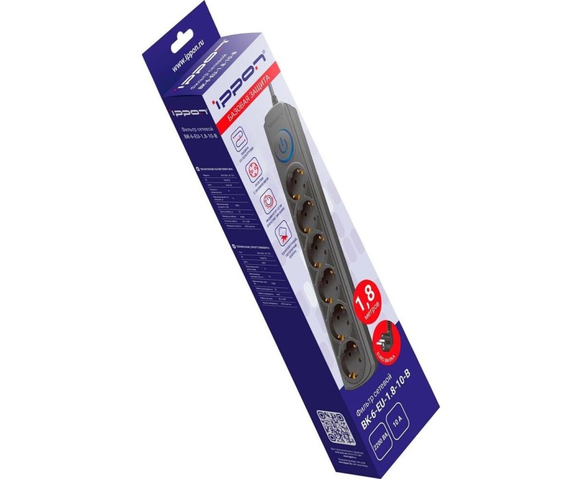 Сетевой фильтр IPPON Сетевой фильтр BK-6-EU-1.8-10-B, 1.8м, черный