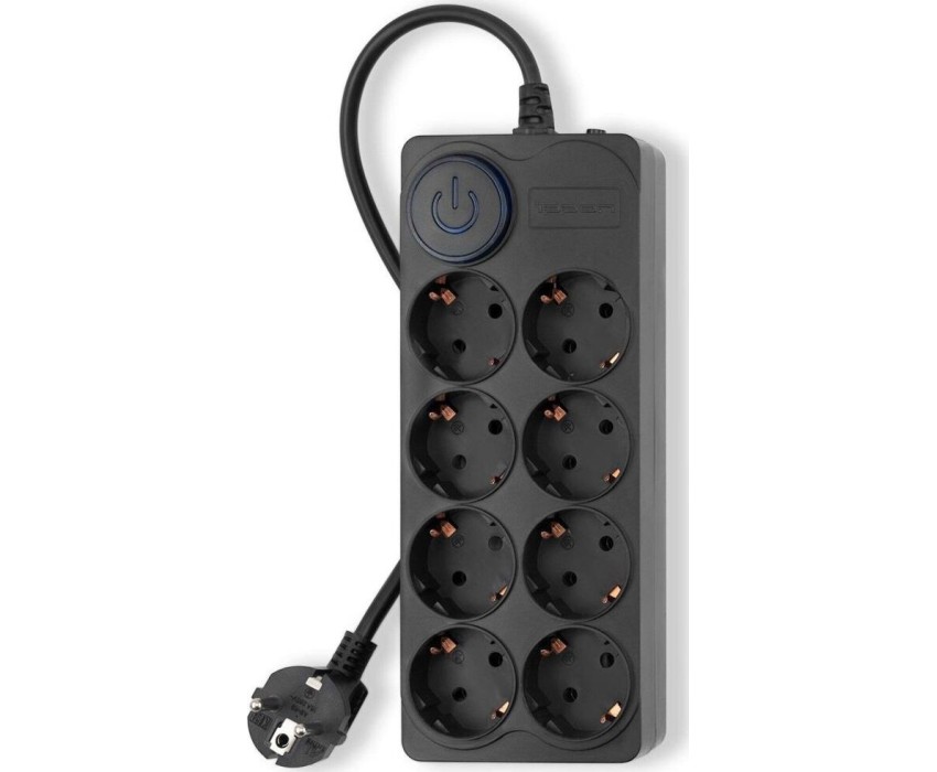 Входная вилка, тип: EURO. Длина шнура: 5. Максимальный ток нагрузки: 10. Максимальная нагрузка: 2200. Номинальное напряжение питающей сети: 220. Частота сети: 50. Максимальный импульсный ток помехи: 4500. Подавление импульсных помех: да. Подавление высокочастотных помех: да. Максимальная рассеиваемая энергия: 150. Защита от короткого замыкания: биметаллический размыкатель. Защита от перегрева: Автоматический (термобиметаллический) предохранитель. Особенности: 8 евророзеток с заземлением. Входная вилка Schuko. Защита от перегрузки. Защита от импульсов высокого напряжения. Защита от перетирания провода в месте входа в корпус фильтра. Ударопрочный негорючий корпус. Кнопка питания с индикатором сети.. Количество выходных розеток: 8. Габариты упаковки (ед) ДхШхВ: 0.27x0.145x0.05. Вес упаковки (ед): 0.5. Гарантия: 24 мес.. Цвет: черный. Входная вилка: EURO. Количество выходных розеток: 8. Максимальная нагрузка: 2200 Вт. Длина шнура: 5 м