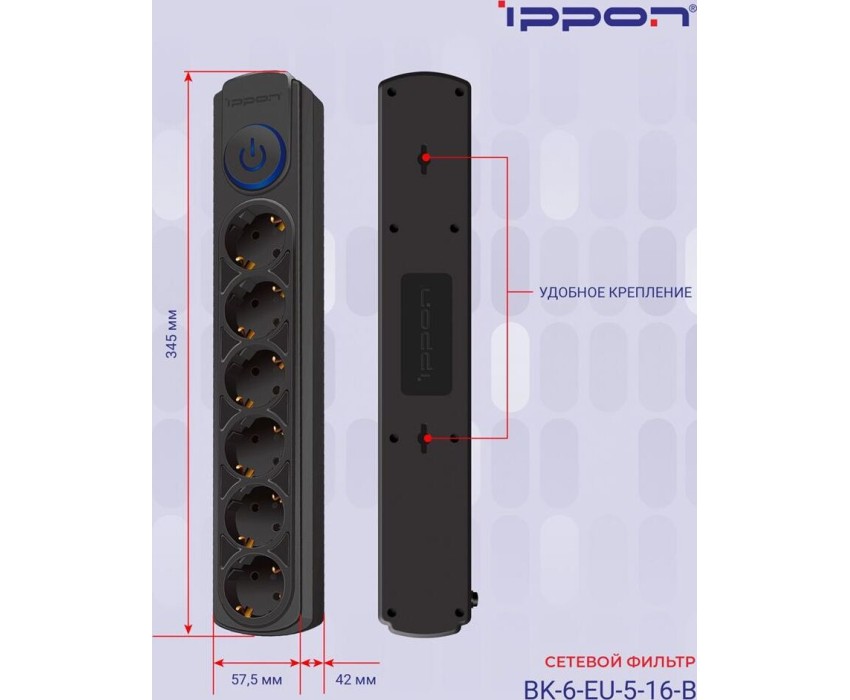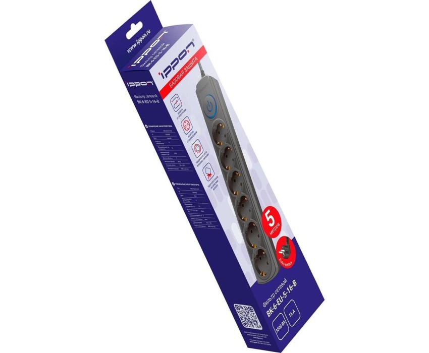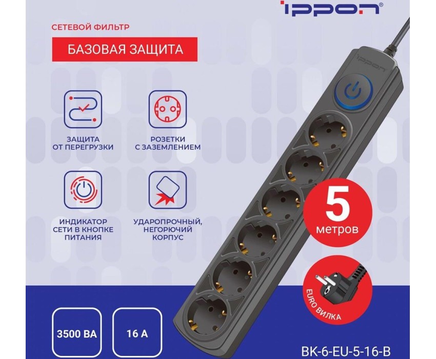 Сетевой фильтр IPPON Сетевой фильтр BK-6-EU-5-16-B, 5м, черный
