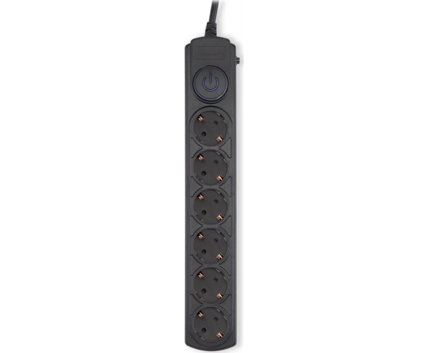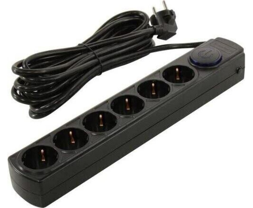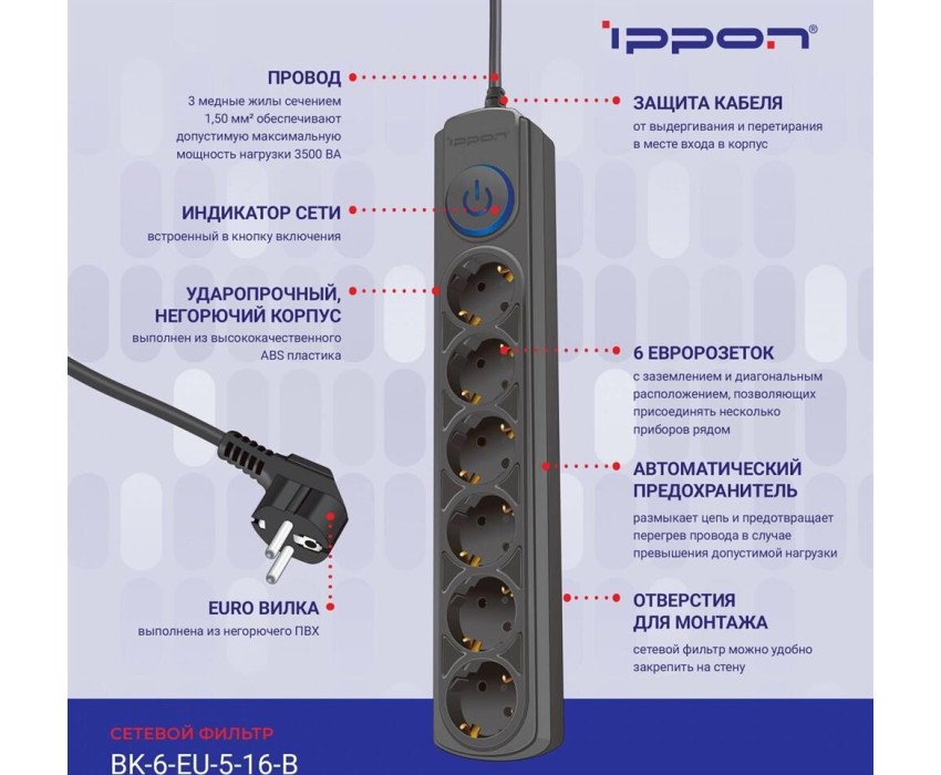 Входная вилка, тип: EURO. Длина шнура: 5. Максимальный ток нагрузки: 16. Максимальная нагрузка: 3500. Номинальное напряжение питающей сети: 220. Частота сети: 50. Максимальный импульсный ток помехи: 4500. Подавление импульсных помех: да. Подавление высокочастотных помех: да. Максимальная рассеиваемая энергия: 150. Защита от короткого замыкания: биметаллический размыкатель. Защита от перегрева: Автоматический (термобиметаллический) предохранитель. Особенности: 6 евророзеток с заземлением. Входная вилка Schuko. Защита от перегрузки. Защита от импульсов высокого напряжения. Защита от перетирания провода в месте входа в корпус фильтра. Ударопрочный негорючий корпус. Кнопка питания с индикатором сети.. Количество выходных розеток: 6. Габариты упаковки (ед) ДхШхВ: 0.39x0.13x0.06. Вес упаковки (ед): 0.82. Гарантия: 24 мес.. Цвет: черный. Длина шнура: 5 м. Количество выходных розеток: 6. Максимальная нагрузка: 3500 Вт. Входная вилка: EURO