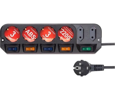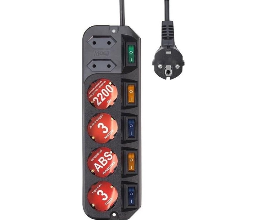 Входная вилка, тип: EURO. Длина шнура: 3. Индивидуальные выключатели розеток: есть. Максимальный ток нагрузки: 10. Максимальная нагрузка: 2200. Номинальный ток: 10. Номинальное напряжение питающей сети: 220. Частота сети: 50. Особенности: Удлинитель Most А10 предназначен для подключения бытовой техники к сети электропитания.У каждой из четырех евророзеток имеется мощный (16A) индивидуальный выключатель,который обеспечивает удобство обращения с электропитанием и экономит Ваше время. Две узкие розетки имеют общий выключатель.. Количество выходных розеток: 6. Габариты упаковки (ед) ДхШхВ: 0.15x0.04x0.33. Вес упаковки (ед): 0.5. Гарантия: 36 мес.. Цвет: черный. Длина шнура: 3 м. Входная вилка: EURO. Количество выходных розеток: 6. Максимальная нагрузка: 2200 Вт. Особенности: индивидуальные выключатели розеток