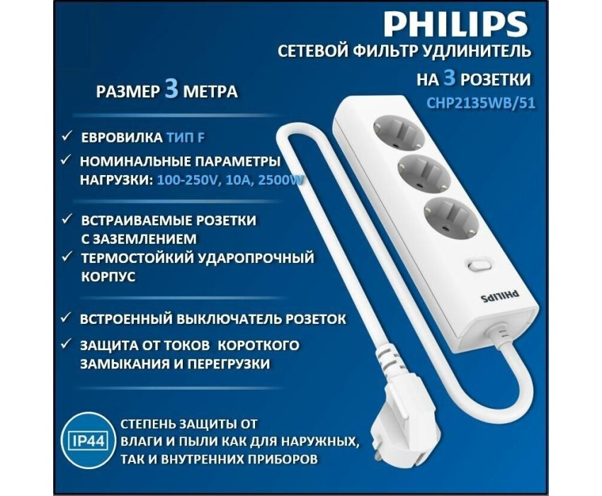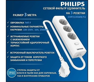 Сетевой фильтр PHILIPS Сетевой фильтр CHP2135WB/51, 3м, белый