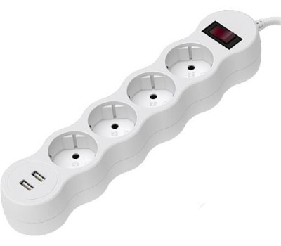 Сетевой фильтр с общим выключателем. Макс. мощность 2300Вт, 10А, 4 евророзетки с заземлением, 2 порта USB-A, защитные шторки, длина кабеля 1.8 метра. Цвет белый.