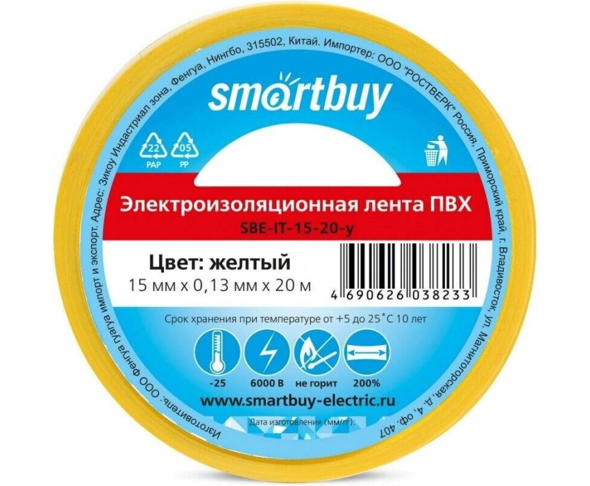 изолента SMARTBUY (SBE-IT-15-20-y) 0,13х15 мм - 20 м желтый