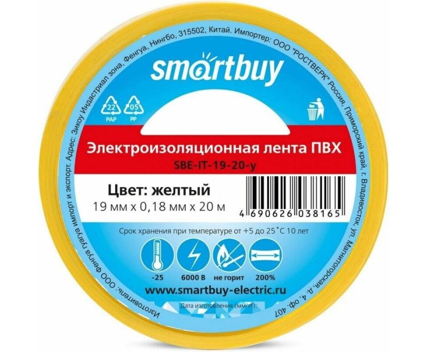 изолента SMARTBUY (SBE-IT-19-20-y) 0,18х19 мм - 20 м желтый