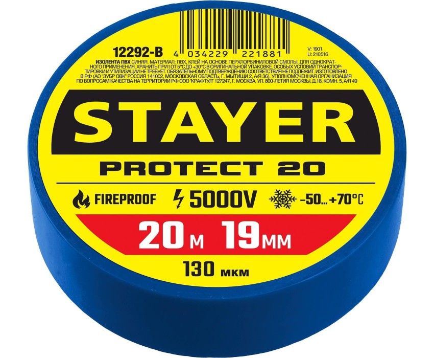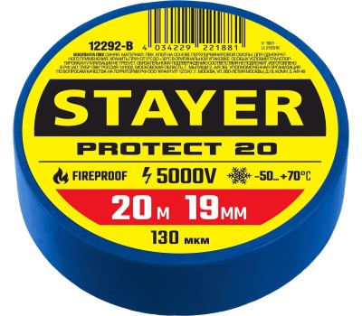 STAYER PROTECT-20, 19 мм х 20 м, 5 000 В, синяя, изолента ПВХ, Professional (12292-B)