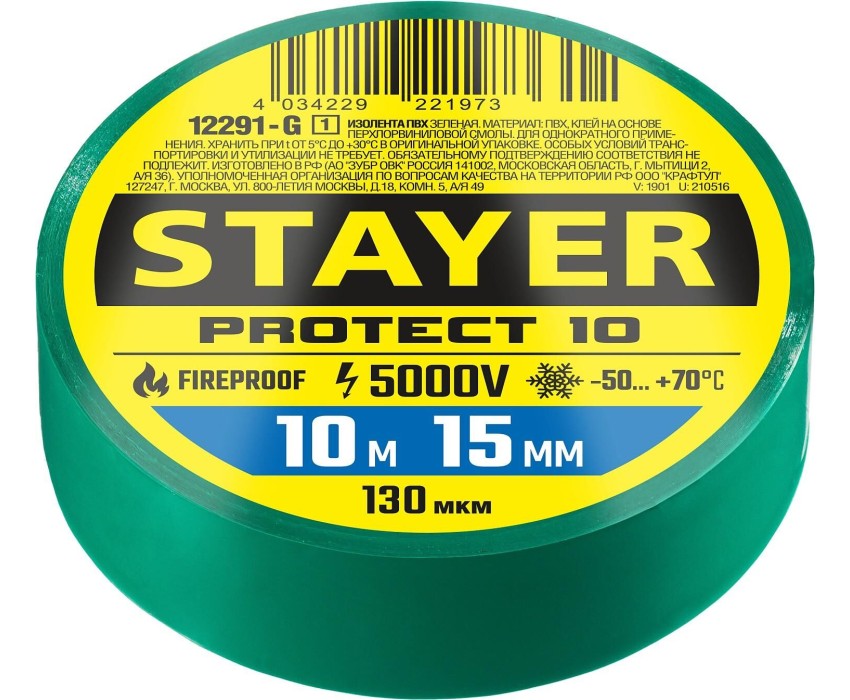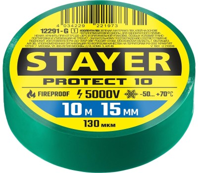 STAYER PROTECT-10, 15 мм х 10 м, 5 000 В, зеленая, изолента ПВХ, Professional (12292-G)