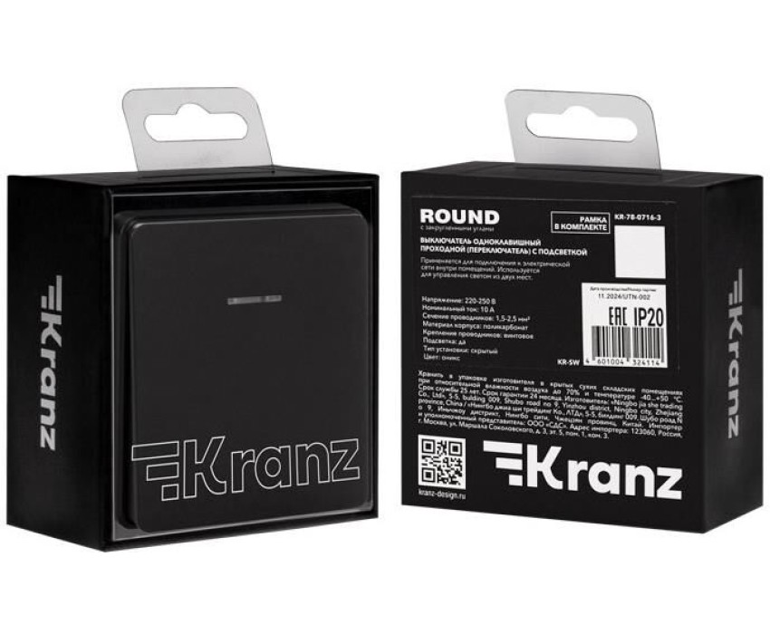 KRANZ Выключатель ROUND 1 кл перекрестный (переключатель) с подсветкой 10А с/у оникс
