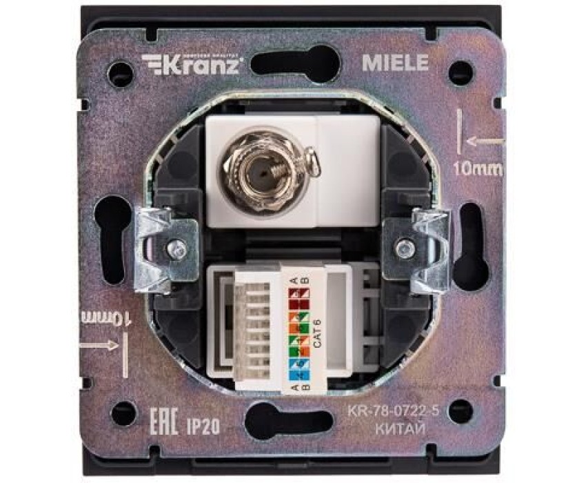 Механизм компьютерной и телевизионной розеток скрытой установки KRANZ предназначен для проводного подключения устройств к сети интернет посредством кабеля RJ45 CAT6, а также для подключения телевизионных приемников к коаксиальной кабельной сети. Используется в квартирах, офисах, в загородных домах. Модель механизма розетки обеспечивает высокоскоростное и бесперебойное соединение. Благодаря лаконичной форме корпуса и нейтральному благородному цвету графит устройство гармонично дополнит любой интерьер. Технические характеристики: частота: 5.0...862.0 Гц.