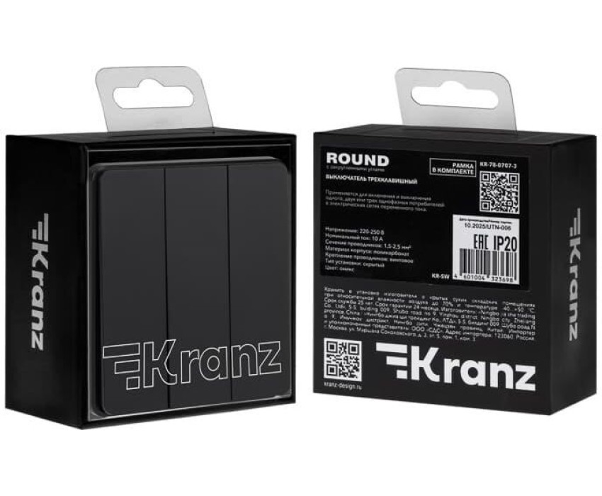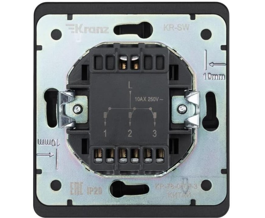 Механизм трехклавишного выключателя скрытой установки KRANZ предназначен для включения и выключения одного, двух или трех однофазных потребителей в электрических сетях переменного тока. Благодаря лаконичной форме корпуса и цвету оникс устройство гармонично дополнит любой интерьер. Сечение проводников составляет 1,5-2,5 мм?.