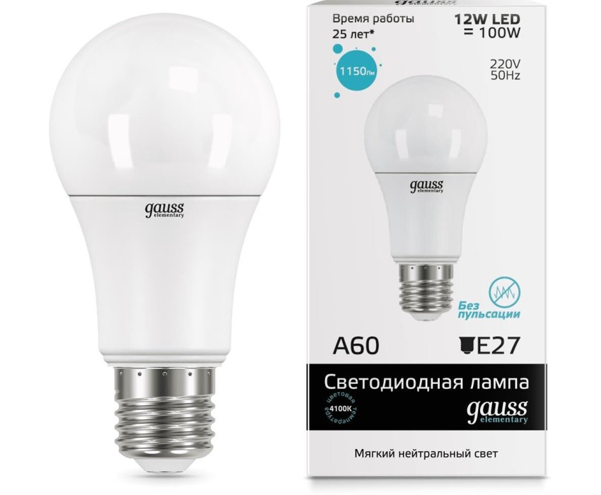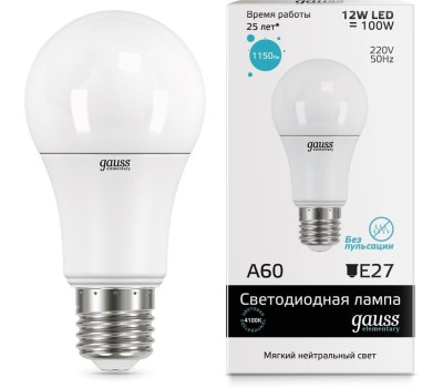 GAUSS 23222 Светодиодная лампа LED Elementary A60 12W E27 1150lm 4100K 1/10/50 0