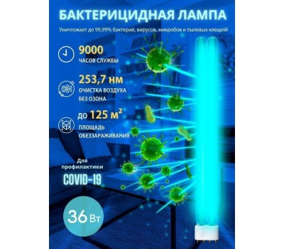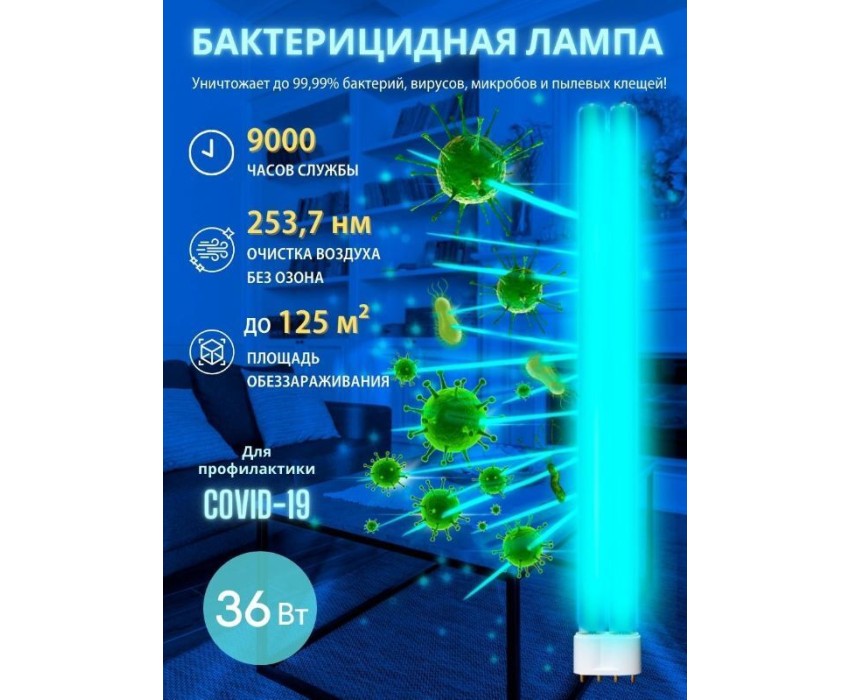 Лампа ультрафиолетовая бактерицидная. Спектр UVC 253,7нм. Цоколь - 2G11. Входное напряжение - 220В. Мощность - 36В. Материал корпуса - стекло. Частота - 50Гц. Диапазон рабочих температур - от -20 до +40.