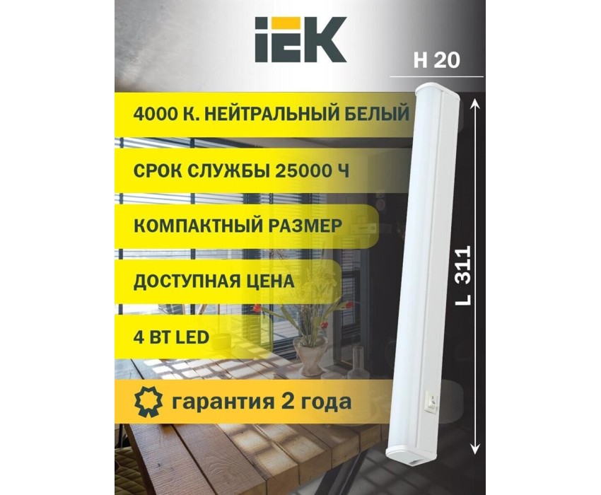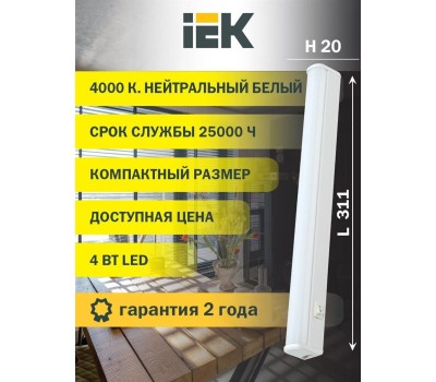 Материал рассеивателя: пластик. Мощность: 4. Напряжение питания: 230. Способ монтажа: накладной. Тип: Светильник. Цветовая температура: 4000. Наличие выключателя: есть. Габариты упаковки (ед) ДхШхВ: 0.32x0.03x0.02. Вес упаковки (ед): 0.3. Гарантия: 24 мес.. Размеры: 311х20х33 мм. Цвет: белый. Монтаж: накладной. Особенности: наличие выключателя. Цветовая температура: 4000 К. Напряжение питания: 230 В. Размеры: 311х20х33 мм