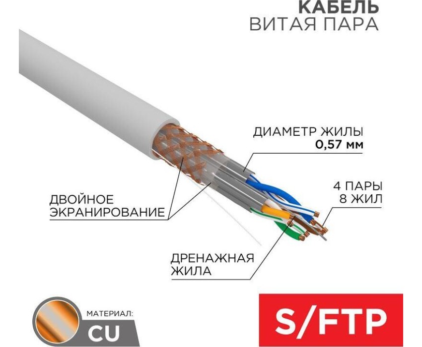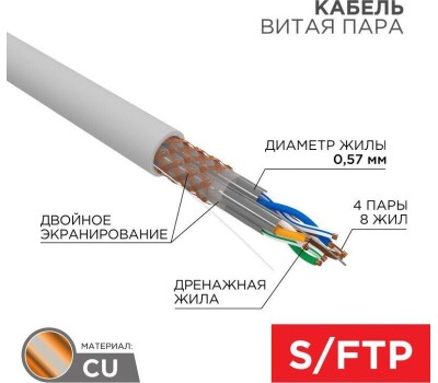 REXANT Кабель витая пара S/FTP, CAT 6A, LSZH нг(А)-HF, 4PR, 23AWG, INDOOR, SOLID, серый, 305м