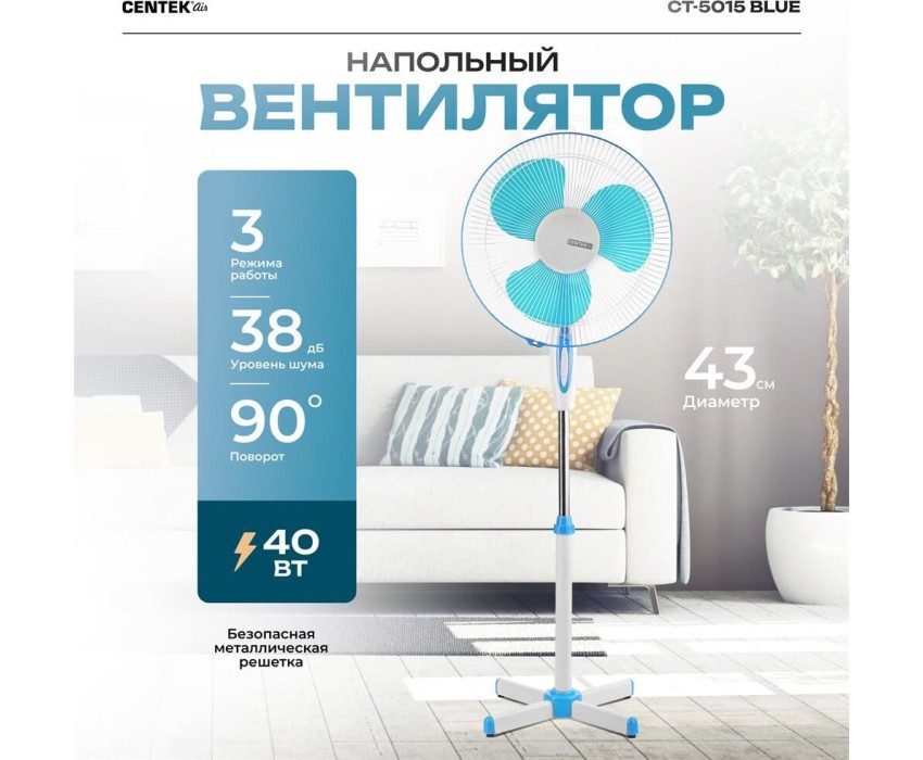 CENTEK CT-5015 BLUE Напряжение питания 220-240 В~50 Гц Мощность 45 Вт Кол-во режимов скорости 3 Максимальная высота 1.25 м Крестообразная база 45х45 см 3 вращающихся лопасти Подсветка Диаметр решетки 43 см Языки документации Русский, Казахский КОМПЛЕКТНОСТЬ 1. Передняя защитная решетка с фиксаторами - 1 шт. 2. Гайка крепления лопастей - 1 шт. 3. Лопасти - 1 шт. 4. Гайка крепления задней решетки - 1 шт. 5. Задняя защитная решетка - 1 шт. 6. Декоративная накладка на решетку - 1 шт. 7. Моторный блок с панелью управления - 1 шт. 8. Стойка с зажимом и выдвижной штангой - 1 шт. 9. Декоративная накладка - 1 шт. 10. Крепежный винт - 4 шт. 11. База - 2 шт. 12. Декоративная накладка на базу - 4 шт.