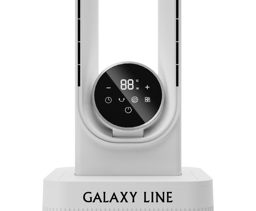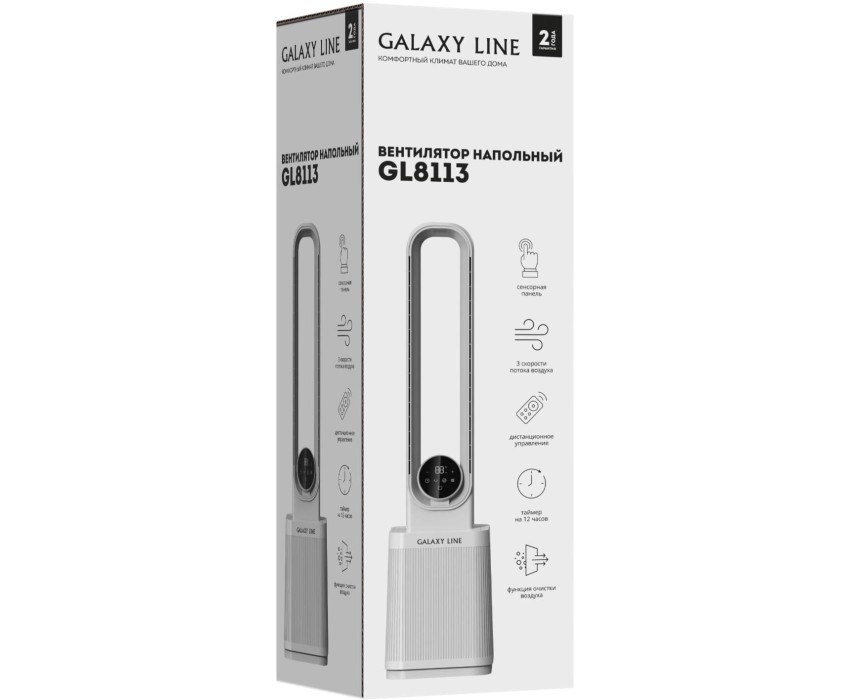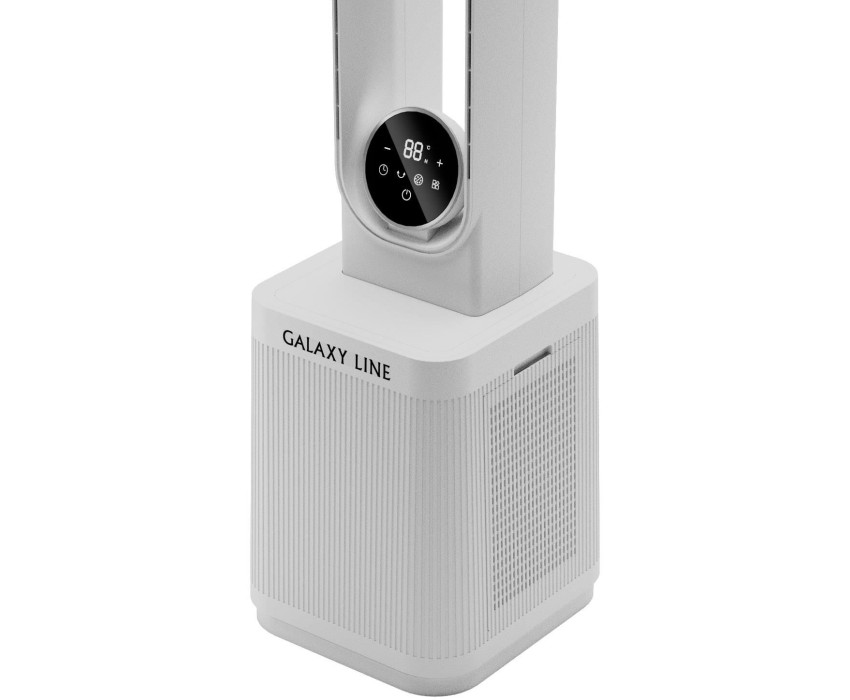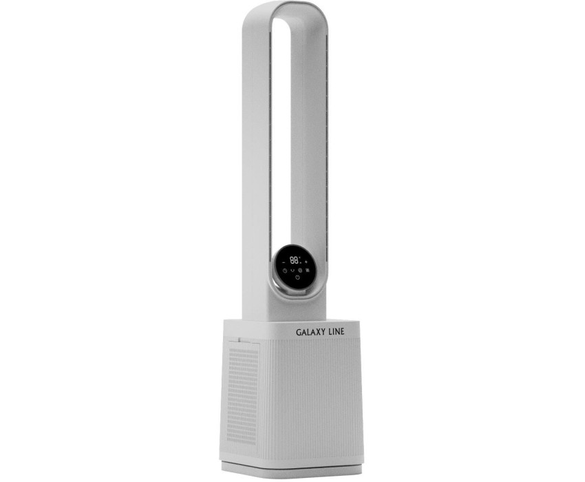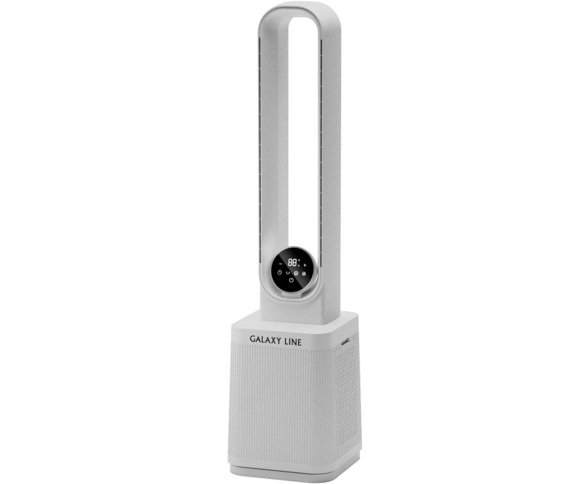 Вентилятор Galaxy LINE GL 8113, белый, напольный безлопастный, 75 Вт, высота 106 см, сенсорное управление, 3 скорости, таймер на 12 часов, функция очистки воздуха, автоматическое вращение на 70°, удобный LED-дисплей, подсветка, низкий уровень шума 50 дБ, пульт дистанционного управления в комплекте