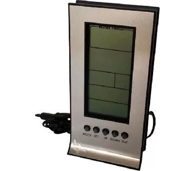 Прогноз погоды, сохранение температурных значений, часы, будильник, обычный календарь, лунный календарь. Выносной датчик проводной (длина провода 1.80 м). Питание автономное, батареи типа ААА.