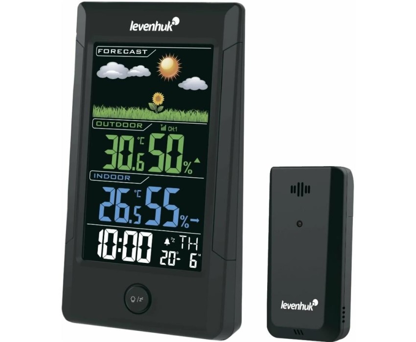 Тип: Термогигрометр. Максимальное количество подключаемых датчиков: 3. Внешний термо/гидродатчик в комплекте: один. Радиус действия внешних датчиков: 80. Электропитание: сетевой адаптер/батарейки. Тип батарей питания: 5xAAA. Индикатор батареи: есть. Анимированный прогноз погоды: есть. Часы: есть. Календарь: есть. Будильник: есть. Тип дисплея: цветной. Цвет корпуса: черный. Подсветка дисплея: есть. Страна производства: Китай. Гарантия: 999 мес.. Диапазон измерения внешней температуры: от -40°С до 70°С. Диапазон измерения влажности в помещении: от 20% до 95%. Диапазон измерения внешней влажности: от 20% до 95%. Диапазон измерения температуры в помещении: до 50°С. Диапазон измерения температуры: внешней от -40°С до 70°С, в помещении до 50°С. Диапазон измерения влажности: внешней от 20% до 95%, в помещении от 20% до 95%. Особенности: часы, будильник, календарь, подсветка дисплея. Внешние датчики: термо/гидродатчик х один. Радиус действия датчиков: 80 м