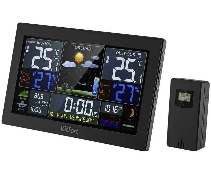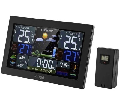 Тип: Погодная станция. Максимальное количество подключаемых датчиков: 3. Измерение атмосферного давления: ДА. Внешний термо/гидродатчик в комплекте: один. Радиус действия внешних датчиков: 60. Электропитание: сетевой адаптер/батарейки. Тип батарей питания: 2xAA. Индикатор батареи: есть. Подключение к ПК: есть. Анимированный прогноз погоды: есть. Отображение фаз луны: ДА. Часы: есть. Календарь: есть. Будильник: есть. Тип дисплея: многоцветный. Цвет корпуса: черный. Вес товара: 500. Определение индекса жары: есть. Подсветка дисплея: есть. Страна производства: Китай. Гарантия: 12 мес.. Диапазон измерения внешней температуры: от -40°С до 70°С. Диапазон измерения влажности в помещении: от 20% до 95%. Диапазон измерения внешней влажности: от 20% до 95%. Размер (ШхВхГ): 225 х 145 х 33 мм. Диапазон измерения температуры в помещении: от -9,9°С до 50°С. Диапазон измерения влажности: внешней от 20% до 95%, в помещении от 20% до 95%. Особенности: часы, будильник, календарь, отображение фаз луны, индекс жары, подключение к ПК, подсветка дисплея. Диапазон измерения температуры: внешней от -40°С до 70°С, в помещении от -9,9°С до 50°С. Радиус действия датчиков: 60 м. Внешние датчики: термо/гидродатчик х один