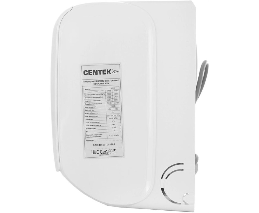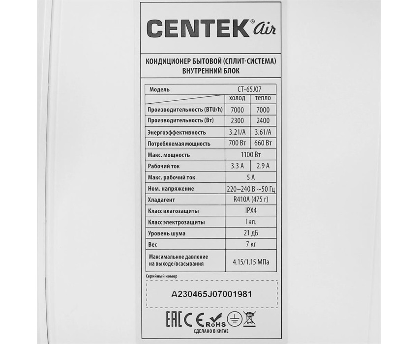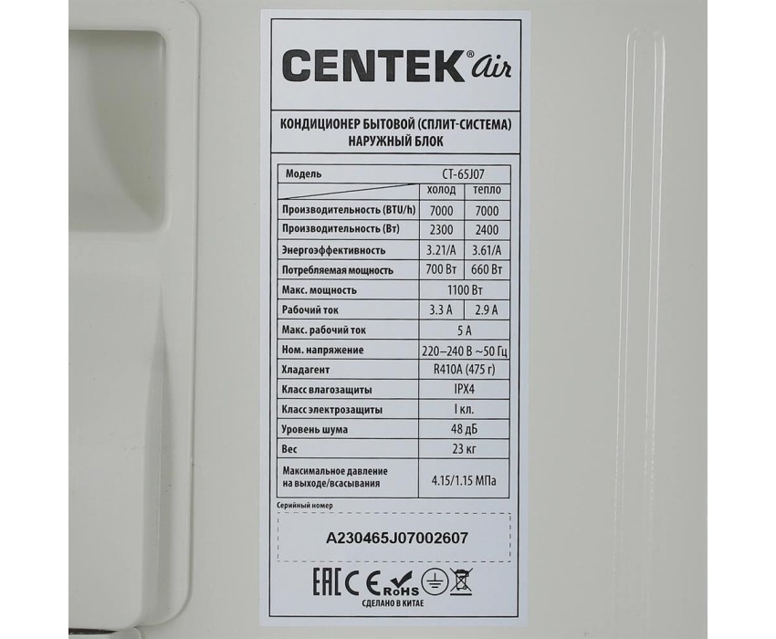 Охлаждение Производительность БТЕ/Вт 7000/2300 Ном. мощность ВТ 700 Ном. ток А 3.3 EER 3.21 Обогрев Производительность БТЕ/Вт 7000/2400 Ном. мощность ВТ 660 Ном. ток А 2.9 COP 3.61 Общее Источник питания В/Гц 220 - 240/ ~ 50 Циркуляция воздуха (м3/ч) 600 Компрессор GMCC Хладагент R410A Гарантия 3 года Класс энергоэффективности A Внутренний блок Уровень шума (внутренний блок) дБ(А) 21 Габариты (ШxВxГ) мм 761х295х200 Упаковка (ШxВxГ) мм 818х360х264 Вес нетто кг 7 Вес брутто кг 8.5 Наружный блок Уровень шума (внешний блок) дБ(А) 48 Габариты (ШxГxВ) мм 660х500х265 Упаковка (ШxГxВ) мм 773х338х541 Вес нетто кг 23 Вес брутто кг 25 Минимально рекомендуемая длина трассы, необходимая для эффективной работы 2 м. Диаметр соединительных труб (жидкостная/газовая) 6,35 / 9,52 Допустимая длина трассы 25 м. Максимальный перепад по высоте 12 м. Дополнительная информация Класс гидроизоляции (внутр/внеш блок) IP IPX4/ IPX4 Класс электрозащиты (внутр/внеш блок) Class I/I Диапазон рабочих температур