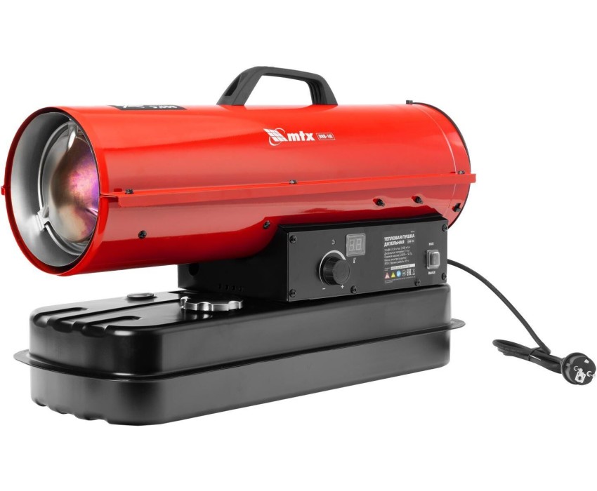 Дизельная тепловая пушка MTX DHB-10i 98904 тепловой мощностью 10 кВт и производительностью 400 м3/ч, с прямым типом нагрева и термостатом, предназначена для обогрева складов, цехов, теплиц и других нежилых помещений. Также используется на производстве и в строительстве: для прогрева бетона, просушки стен и разморозки траншей. Важно: в обогреваемом помещении необходимо обеспечить хорошую вентиляцию! Преимущества Эффективность — система прямого нагрева позволяет быстро прогреть воздух в помещении до нужной температуры. Автономность — встроенный термостат поддерживает заданную температуру без участия пользователя. Удобный контроль работы — LED-дисплей отображает значения текущей и заданной температуры, а также выводит сообщения об ошибках, манометр позволяет следить за давлением топливного насоса. Экономичность — полного бака хватает более чем на 15 часов работы. Термозащита — в случае перегрева на LED-дисплее возникает ошибка и дизельная пушка отключается. Бесперебойная работа — индикатор уровня топлива позволяет вовремя проводить заправку. Защита от засорения — топливный фильтр препятствует попаданию посторонних частиц в бак, воздушные фильтры обеспечивают чистый поток воздуха. Удобное перемещение — в верхней части корпуса предусмотрена транспортировочная рукоятка.