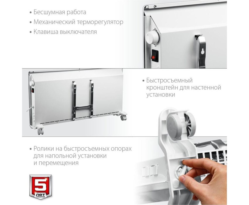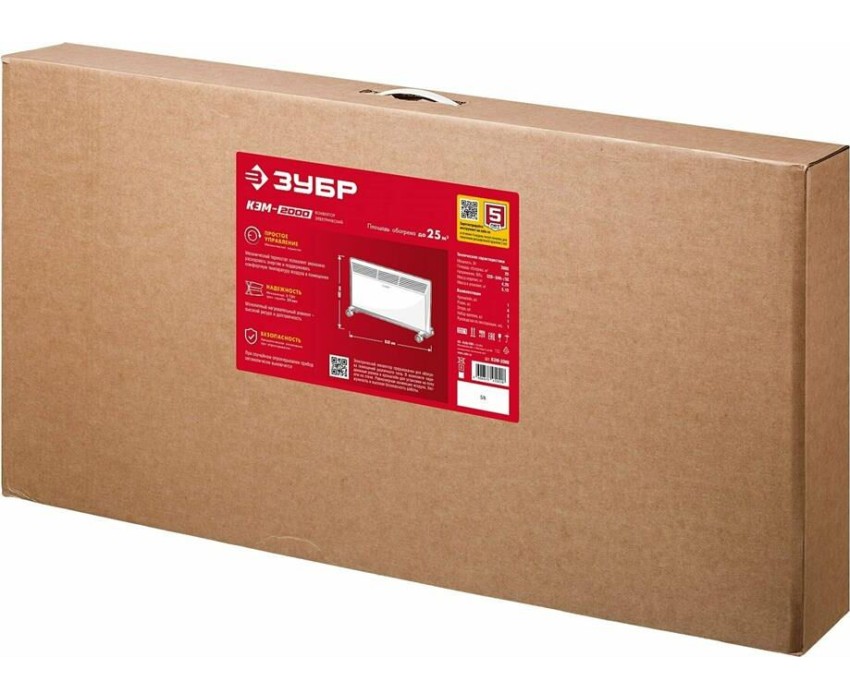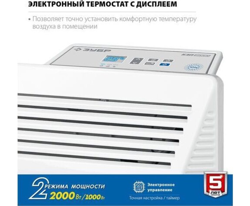 Электрический конвектор ЗУБР профессионал мощностью 2000 Вт - подойдет для обогрева любых домашних и офисных помещений площадью до 25 м2. Электронный терморегулятор и ионизация воздуха обеспечит равномерный нагрев помещения и создаст неповторимую атмосферу комфорта. Технические характеристики: -Мощность: 2000 Вт -Рекомендуемая площадь обогрева: 25 м2 -Количество режимов нагрева: 2 -Регулировка температуры: Электронный термостат -Тип нагревательного элемента: Х-тен -Защита от опрокидывания: есть -Ионизация воздуха: есть -Тип крепления: Настенный/напольный -Длина кабеля: 1,4 м -Масса изделия: 4,25 кг -Масса изделия в упаковке: 5,15 кг -Напряжение: 230~/50 В/Гц -Габариты изделия: 830х400х83 мм -Габариты изделия в упаковке: 850х450х125 мм